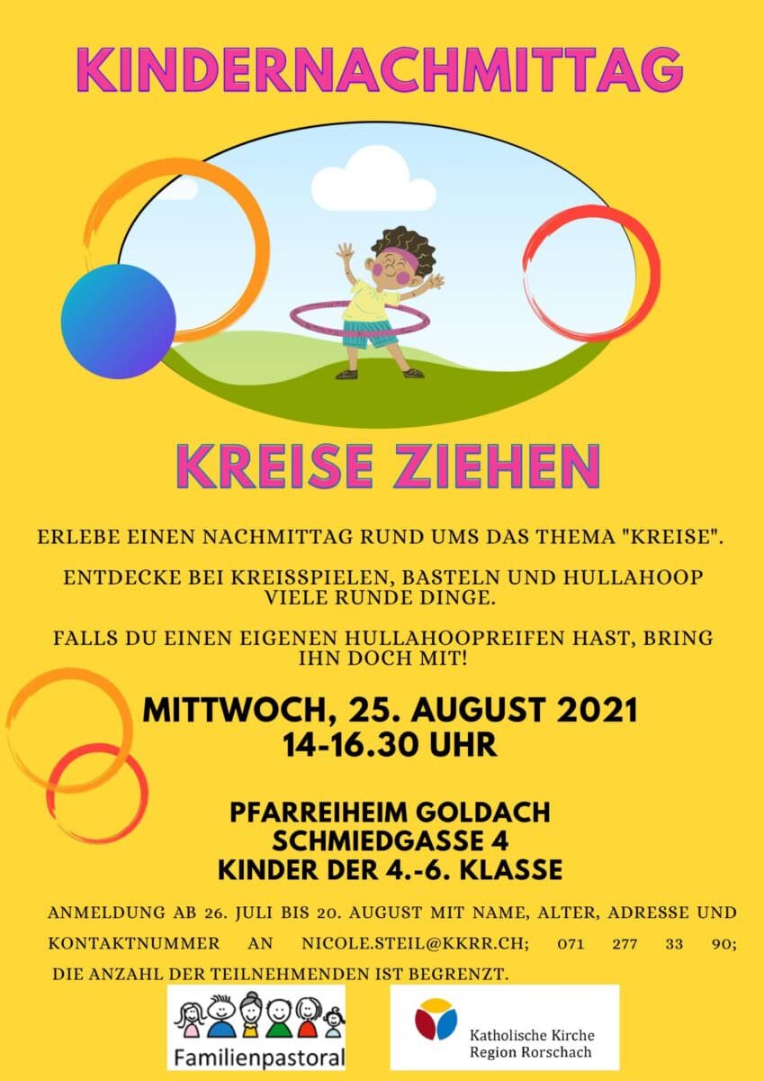 Der Kindernachmittag „Kreise ziehen“ findet am 25. August in Goldach statt und zwar für Kinder in der Mittelstufe. Eine Anmeldung ist noch bis kommenden Freitag, 20. August, möglich. Die Initiant:innen freuen sich auf einen tollen Nachmittag mit hoffentlich vielen Kids.