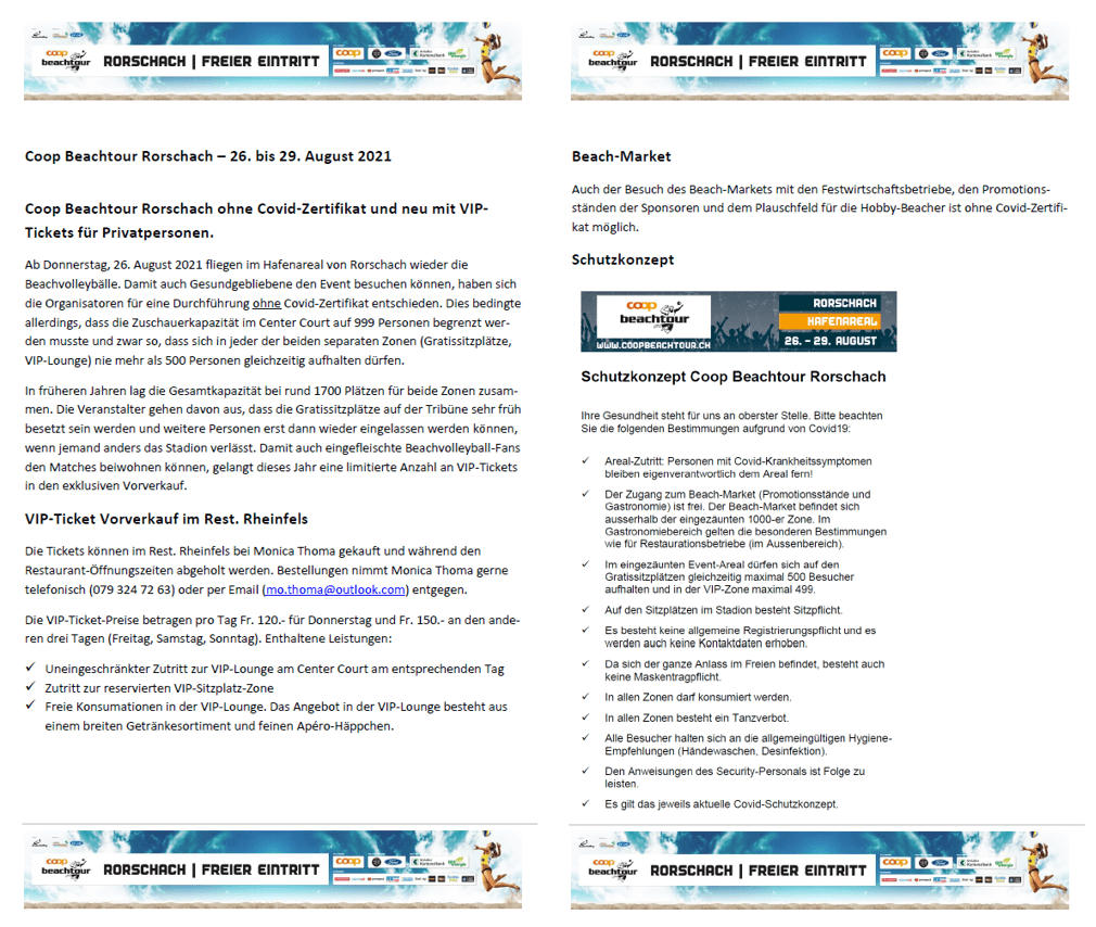 Beachevent: Schutzkonzepte und VIP-VorverkaufThemen:Coop Beachtour 2021KulturPartnerRorschach Keywords: Beachtour;Beachvolleyball 18. August 2021 - 05:20Die VIP-Tickets gibt’s bei Moni Thoma >> Telefon 079 324 72 63 oder per Mail. Mehr zur Coop Beachtour in Rorschach findet man hier. Teilen mit: Klicken, um einem Freund einen Link per E-Mail zu senden (Wird in neuem Fenster geöffnet) E-Mail Klicken zum Ausdrucken (Wird in neuem Fenster geöffnet) Drucken Klick, um auf Facebook zu teilen (Wird in neuem Fenster geöffnet) Facebook Klicke, um auf X zu teilen (Wird in neuem Fenster geöffnet) X Klicken, um auf WhatsApp zu teilen (Wird in neuem Fenster geöffnet) WhatsApp Gefällt mir:Gefällt mir Wird geladen …Newsletter abonnieren Bitte dieses Feld leer lassenBitte wähle, ob Du über jeden neuen Beitrag sofort oder lieber jeden Morgen gegen 9 Uhr eine Zusammenfassung der neusten Beiträge erhalten möchtest.Liste(n) auswählen: Neues vom Echo (Zusammenfassung) Neues vom Echo (Sofortbenachrichtigung) Dieses Feld wird benötigt.Prüfen Sie Ihren Posteingang und den Spamordner, um Ihr Abonnement zu bestätigen.