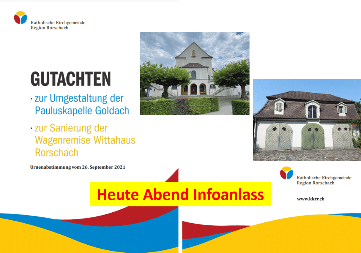 Der Kirchenverwaltungsrat der Katholischen Kirche der Region Rorschach hat für den 26. September 2021 zwei Urnenabstimmungen angesetzt. Zum einen geht es um den Investitionskredit zur Umgestaltung der Pauluskapelle Goldach, zum anderen um die Sanierung der Wagenremise beim Wittahaus in Rorschach. Die Stimmberechtigten und Interessierte sind eingeladen, sich über die Projekte zu informieren: