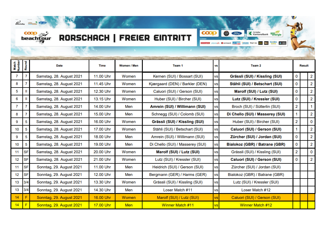 Beachtour: Resultate von gestern & Spiele von heuteThemen:Coop Beachtour 2021KulturRorschach 29. August 2021 - 05:50Heute Sonntag beginnen die Spiele am Rorschacher Hafenareal um 11 Uhr. Folgende Social-Media-Kanäle sind weiterhin in Betrieb: Instagram, Facebook, YouTube. Resultate, Spielpläne und Bilder stammen zum Teil vom Pressedienst der Coop Beachtour. Teilen mit: Einen Link per E-Mail an einen Freund senden (Wird in neuem Fenster geöffnet) E-Mail Drucken (Wird in neuem Fenster geöffnet) Drucken Auf Facebook teilen (Wird in neuem Fenster geöffnet) Facebook Auf X teilen (Wird in neuem Fenster geöffnet) X Auf WhatsApp teilen (Wird in neuem Fenster geöffnet) WhatsApp Gefällt mir:Gefällt mir Wird geladen …Newsletter abonnieren Bitte dieses Feld leer lassenBitte wähle, ob Du über jeden neuen Beitrag sofort oder lieber jeden Morgen gegen 9 Uhr eine Zusammenfassung der neusten Beiträge erhalten möchtest.Liste(n) auswählen: Neues vom Echo (Zusammenfassung) Neues vom Echo (Sofortbenachrichtigung) Dieses Feld wird benötigt.Prüfen Sie Ihren Posteingang und den Spamordner, um Ihr Abonnement zu bestätigen.