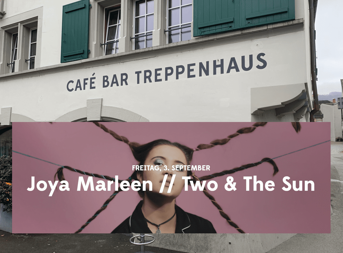 Heute Abend Doppelkonzert im TreppenhausThemen:BeizenKulturRorschachTreppenhaus 3. September 2021 - 05:01Infos wie immer auf der Treppenhaus-Homepage. Dort sind auch die aktuellen Zutrittsbestimmungen aufgeführt.Joya MarleenTwo & the sunTeilen mit: Einen Link per E-Mail an einen Freund senden (Wird in neuem Fenster geöffnet) E-Mail Drucken (Wird in neuem Fenster geöffnet) Drucken Auf Facebook teilen (Wird in neuem Fenster geöffnet) Facebook Auf X teilen (Wird in neuem Fenster geöffnet) X Auf WhatsApp teilen (Wird in neuem Fenster geöffnet) WhatsApp Gefällt mir:Gefällt mir Wird geladen …Newsletter abonnieren Bitte dieses Feld leer lassenBitte wähle, ob Du über jeden neuen Beitrag sofort oder lieber jeden Morgen gegen 9 Uhr eine Zusammenfassung der neusten Beiträge erhalten möchtest.Liste(n) auswählen: Neues vom Echo (Zusammenfassung) Neues vom Echo (Sofortbenachrichtigung) Dieses Feld wird benötigt.Prüfen Sie Ihren Posteingang und den Spamordner, um Ihr Abonnement zu bestätigen.