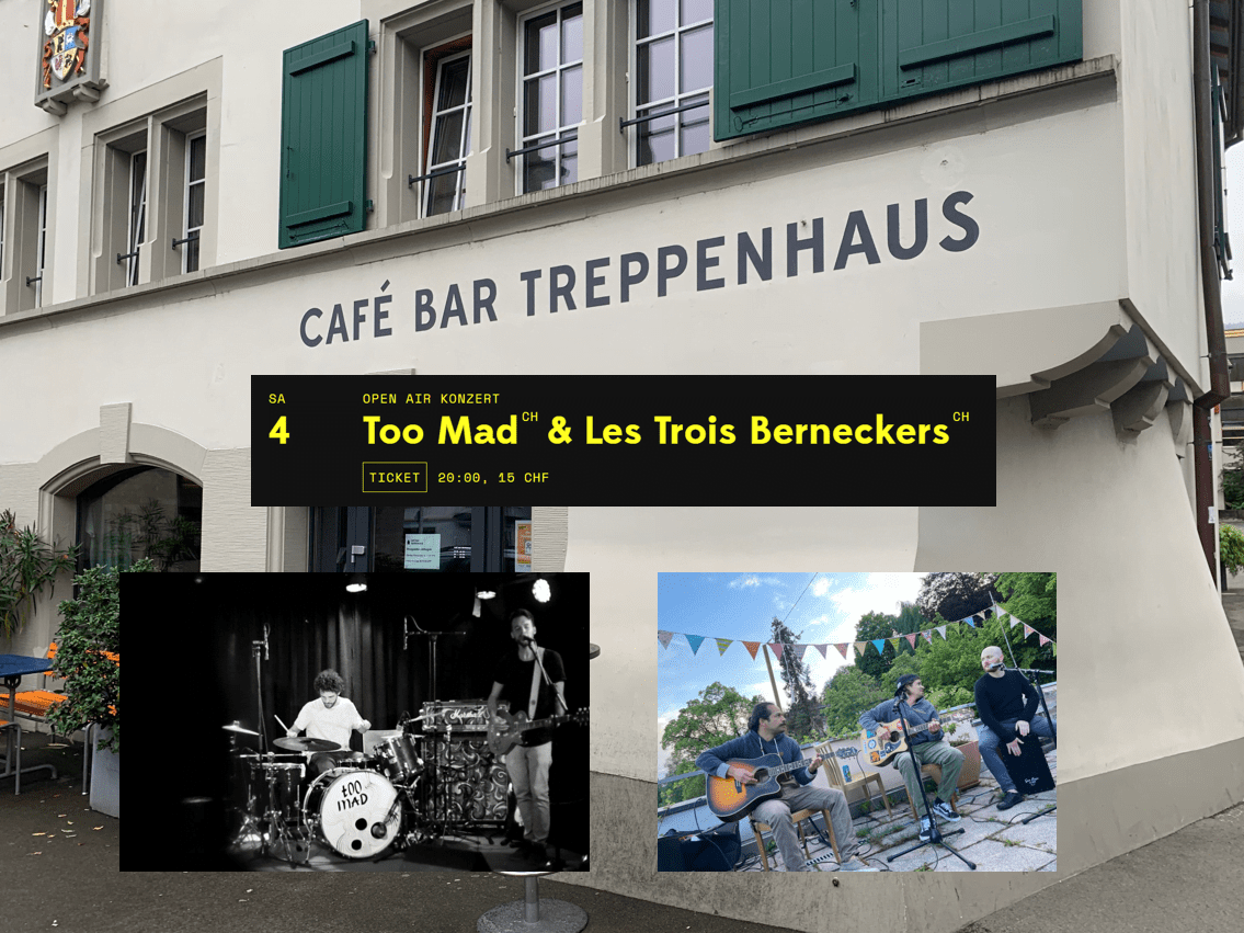 Die beiden Schweizerbands „Too Mad“ und „Les Trois Berneckers“ sind heute live zu hören. Das Konzert findet bei Schönwetter auf dem Kirchplatz statt. Bei schlechter Witterung wird die Veranstaltung im Treppenhaus durchgeführt. Zutrittsbestimmungen beachten!!