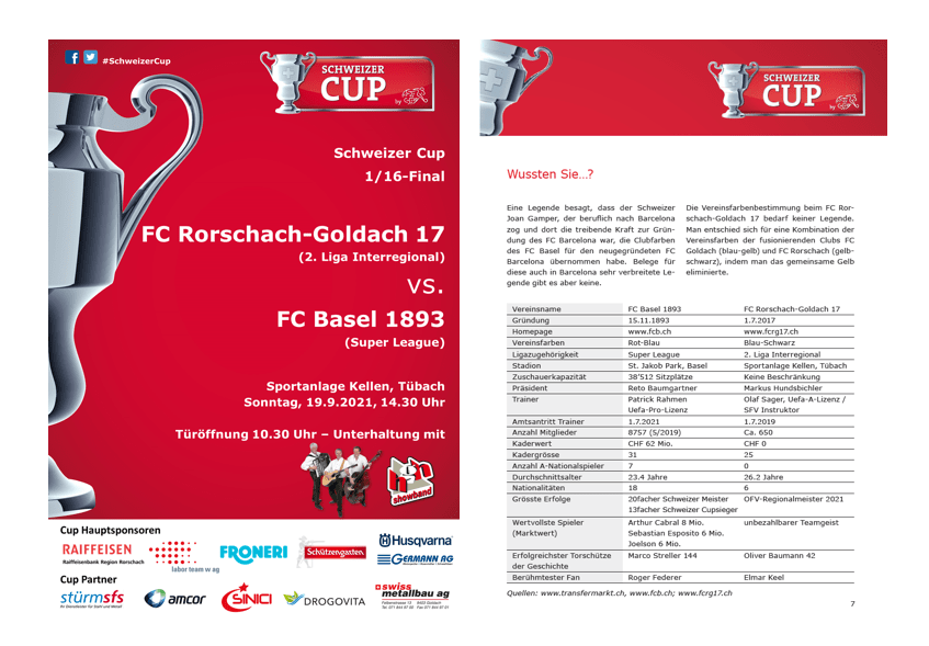 Wenn zwei sehr ungleiche Gegner gegeneinander antreten, dann spricht man häufig von einem Kampf wie bei „David gegen Goliath“. Und man weiss ja, wie diese biblische Geschichte endet… Das hier ist ein Ausschnitt aus dem Matchprogramm, welches am Match Tag abgegeben wird. Mehr Infos rund um das Cupspiel gibt es hier und auch hier. Tickets kann man immer noch online lösen.