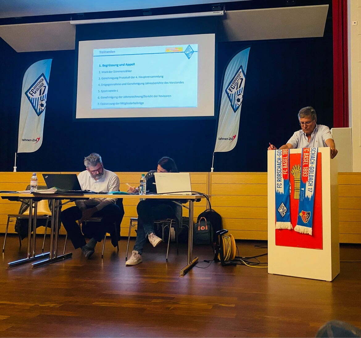Präsident Markus Hundsbichler begrüsste 83 anwesende Mitglieder. Nebst 68 Entschuldigten waren auch keine Mitglieder der Gemeinden Rorschach oder Goldach anwesend. Der Präsident blickte nochmals zurück auf ein ereignisreiches Jahr; geschlossenes Kellen Restaurant, Unterbruch der Fussball-Meisterschaft, Pesta-Neubau, Aufstieg, Cupspiel usw. brachten die Crew des Vorstandes immer wieder ans Limit. Nach Film-Highlights aus den drei wichtigsten Spielen (Ruggell, Frauenfeld und Basel) bedankte sich Hundsbichler bei allen Vereinsmitglieder:innen und freiwilligen Helfer:innen für ihren Einsatz betreffend Cupspiel. Vor allem die Zusammenarbeit unter den verschiedenen Mannschaften im Verein habe ihn sehr gefreut. Dabei habe man sehen können, wie wichtig zum Beispiel Mannschaften der 5. Liga oder Junioren der 2. Stärkeklasse mit ihren Trainern sind. Für die Zukunft prophezeit er einen Ausbau des Sekretariates (Vollamt), sowie die Ausweitung der Vereinsverantwortung auf weitere, zuverlässige Personen.