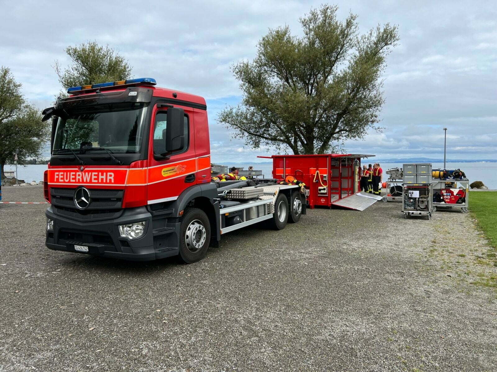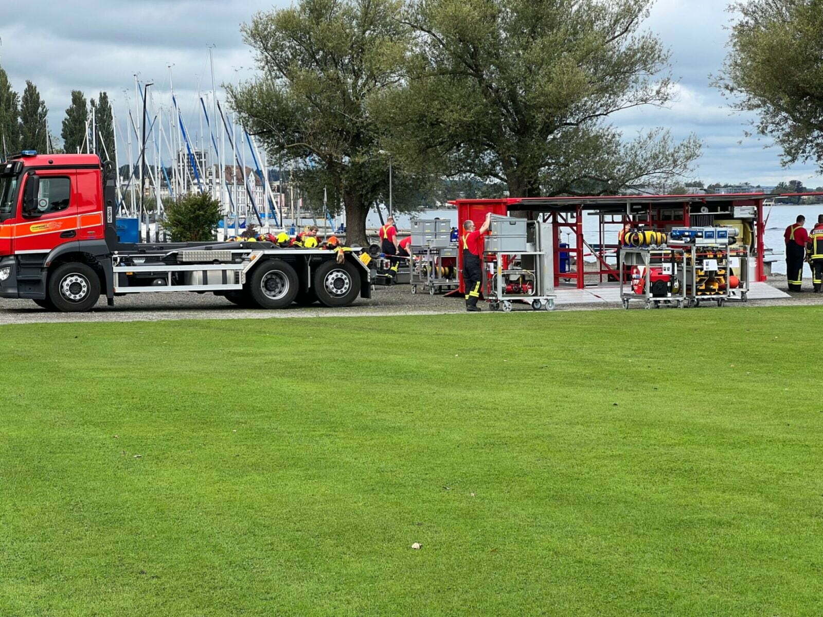 Für Angehörige der Feuerwehr Rorschach-Rorschacherberg sind Kurse häufig. Nur so ist sichergestellt, dass bei Ernsteinsätzen die Handgriffe sitzen. Seit Mittwoch findet so ein Einführungs- und Weiterbildungskurs statt. Am Mittwoch noch beim Yachthafen, gestern und heute bei der ehemaligen Fischzucht. Beübt wird das Erstellen vom Schwimmsperren bei einem Bacheinlauf, der Aufbau der so genannten Skimmerstrasse, der Aufbau einer Mopmatic-Wringerstrasse und der Aufbau eines Koaleszenz-Seperators.
