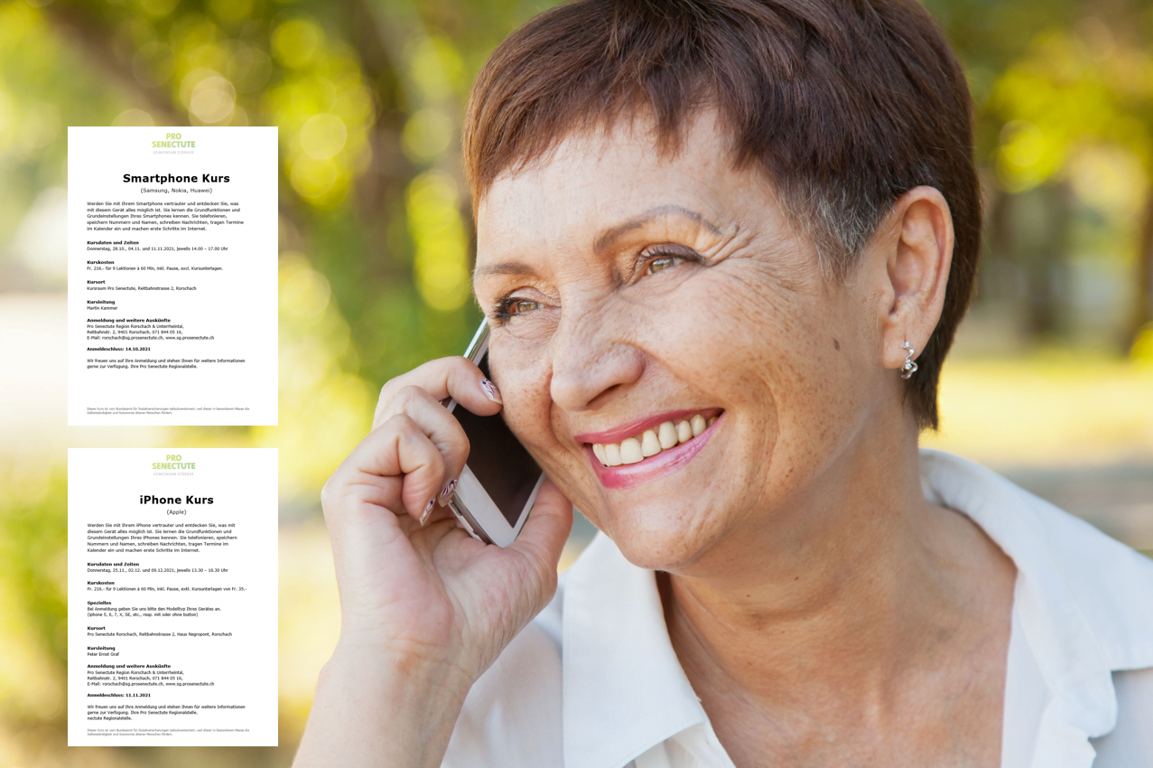 Pro Senectute bietet einen Smartphone wie auch einen iPhone Kurs an. Details findet man auf den Flyern unten. Anmeldeschluss beachten.