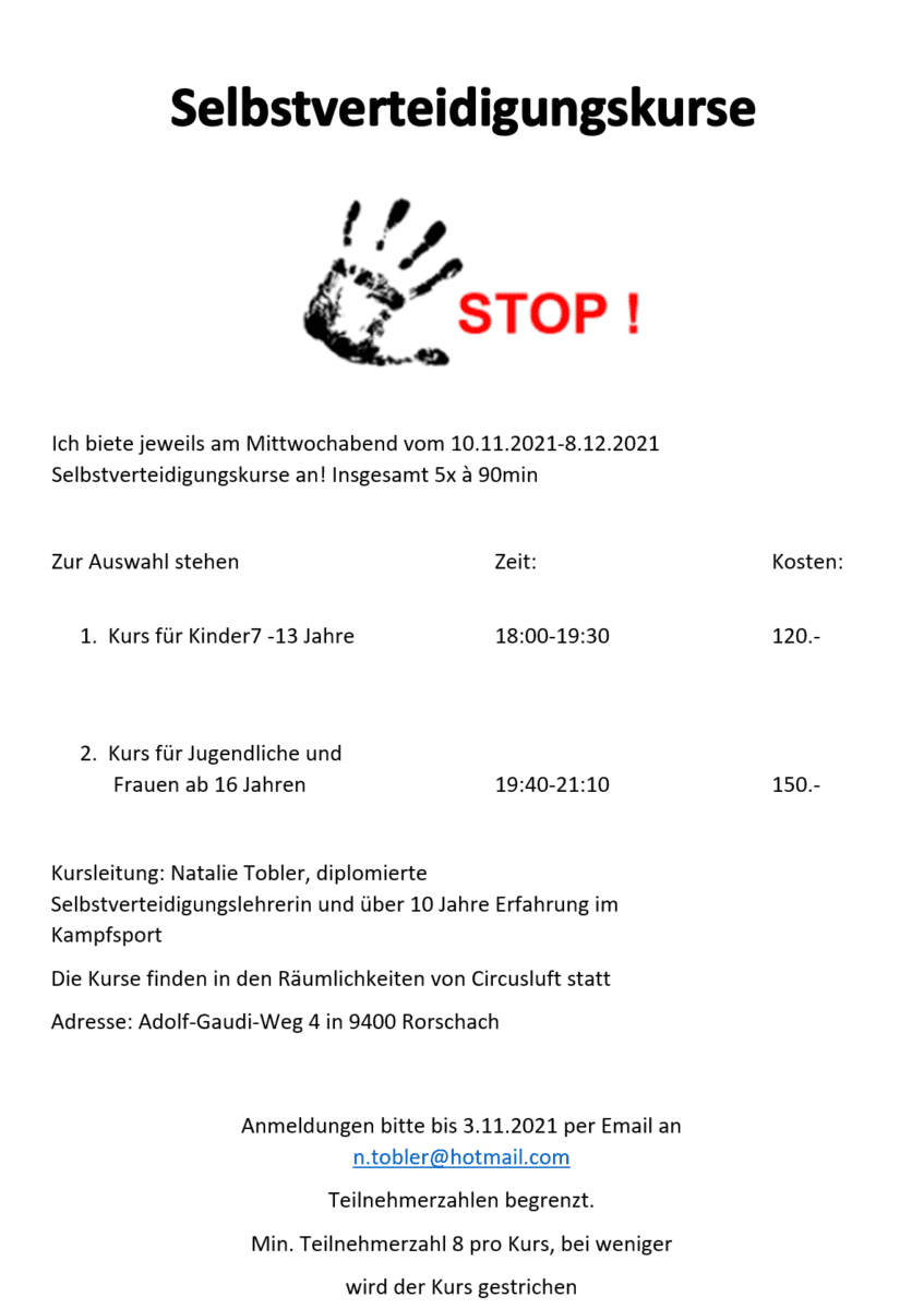 Start ist am 10. November 2021. Der Kurs wird am Adolf-Gaudy-Weg 4 in Rorschach durchgeführt. Anmelden muss man sich bis am 3. November 2021.