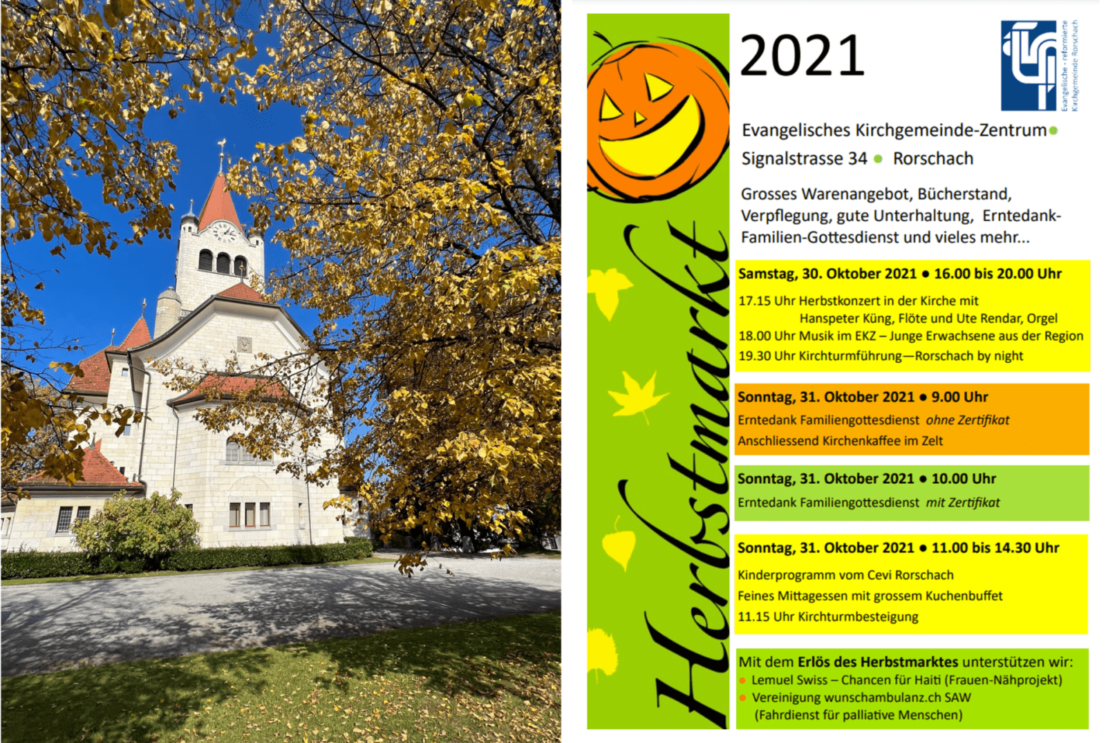 Samstag und Sonntag findet auf dem Areal der Evangelischen Kirche in Rorschach der traditionelle Herbstmarkt statt. Immer speziell ist die Kirchturmführung. Samstagabend kann man ab 19.30 Uhr „Rorschach by night“ erleben.