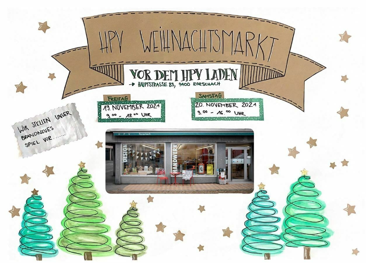 Der Weihnachtsmarkt des HPV Rorschach findet heute und morgen vor dem HPV Laden an der Hauptstrasse 83 in Rorschach statt. Neben kreativen Geschenkideen erwartet die Besucher:innen ein brandneues Gesellschaftsspiel aus den Werkstätten des HPV Rorschach. Das Spiel ist aus einer Vision entstanden, ein Spiel zu entwickeln, das sich dem Niveau der Mitspielenden anpasst.