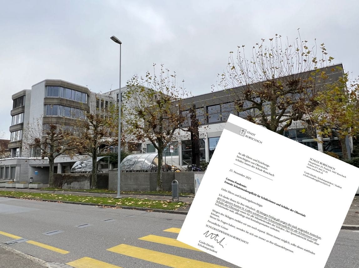 Mit einem Schreiben (siehe unten) an die Eltern und Erziehungsberechtigen von Oberstufenschüler:innen informiert Schulratspräsident Guido Etterlin, dass ab morgen Freitag (26.11.2021) in den Schulhäusern Burghalden und Kreuzacker wieder eine Schutzmaskenpflicht für alle Schüler:innen und Mitarbeitenden der Schule besteht. Weitere Details finden Interessierte im Brief.