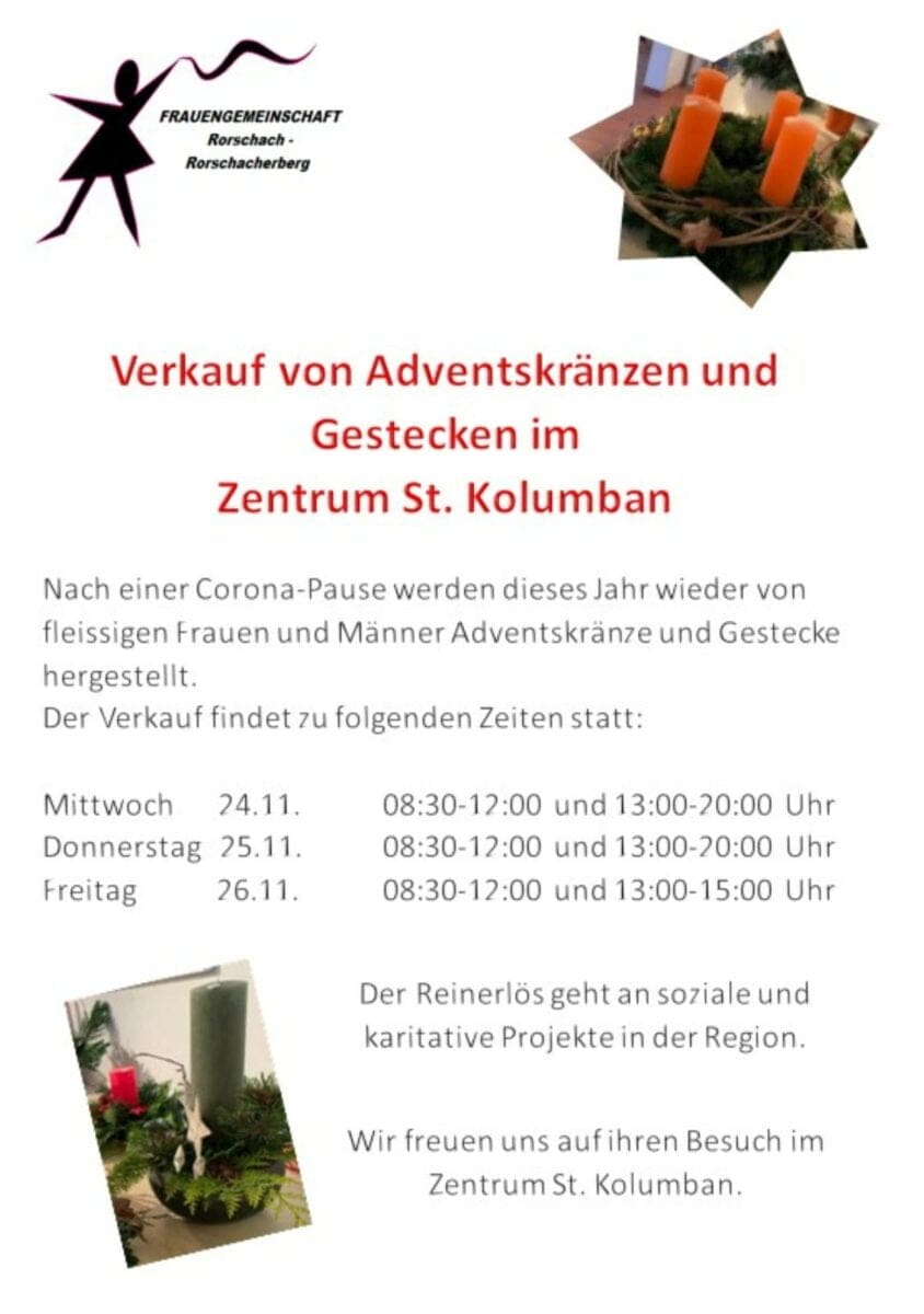 Verkauf von Adventskränzen & GesteckenThemen:AdventKath. RorschachKulturPartnerRorschach 25. November 2021 - 05:25 Seit gestern verkauft die Frauengemeinschaft Rorschach-Rorschacherberg im Zentrum St.Kolumban Adventskränze und Gestecke. Das Ganze dauert noch bis Freitag. Mehr Infos gibt es auf dem Flyer unten.Teilen mit: Einen Link per E-Mail an einen Freund senden (Wird in neuem Fenster geöffnet) E-Mail Drucken (Wird in neuem Fenster geöffnet) Drucken Auf Facebook teilen (Wird in neuem Fenster geöffnet) Facebook Auf X teilen (Wird in neuem Fenster geöffnet) X Auf WhatsApp teilen (Wird in neuem Fenster geöffnet) WhatsApp Gefällt mir:Gefällt mir Wird geladen …Newsletter abonnieren Bitte dieses Feld leer lassenBitte wähle, ob Du über jeden neuen Beitrag sofort oder lieber jeden Morgen gegen 9 Uhr eine Zusammenfassung der neusten Beiträge erhalten möchtest.Liste(n) auswählen: Neues vom Echo (Zusammenfassung) Neues vom Echo (Sofortbenachrichtigung) Dieses Feld wird benötigt.Prüfen Sie Ihren Posteingang und den Spamordner, um Ihr Abonnement zu bestätigen.