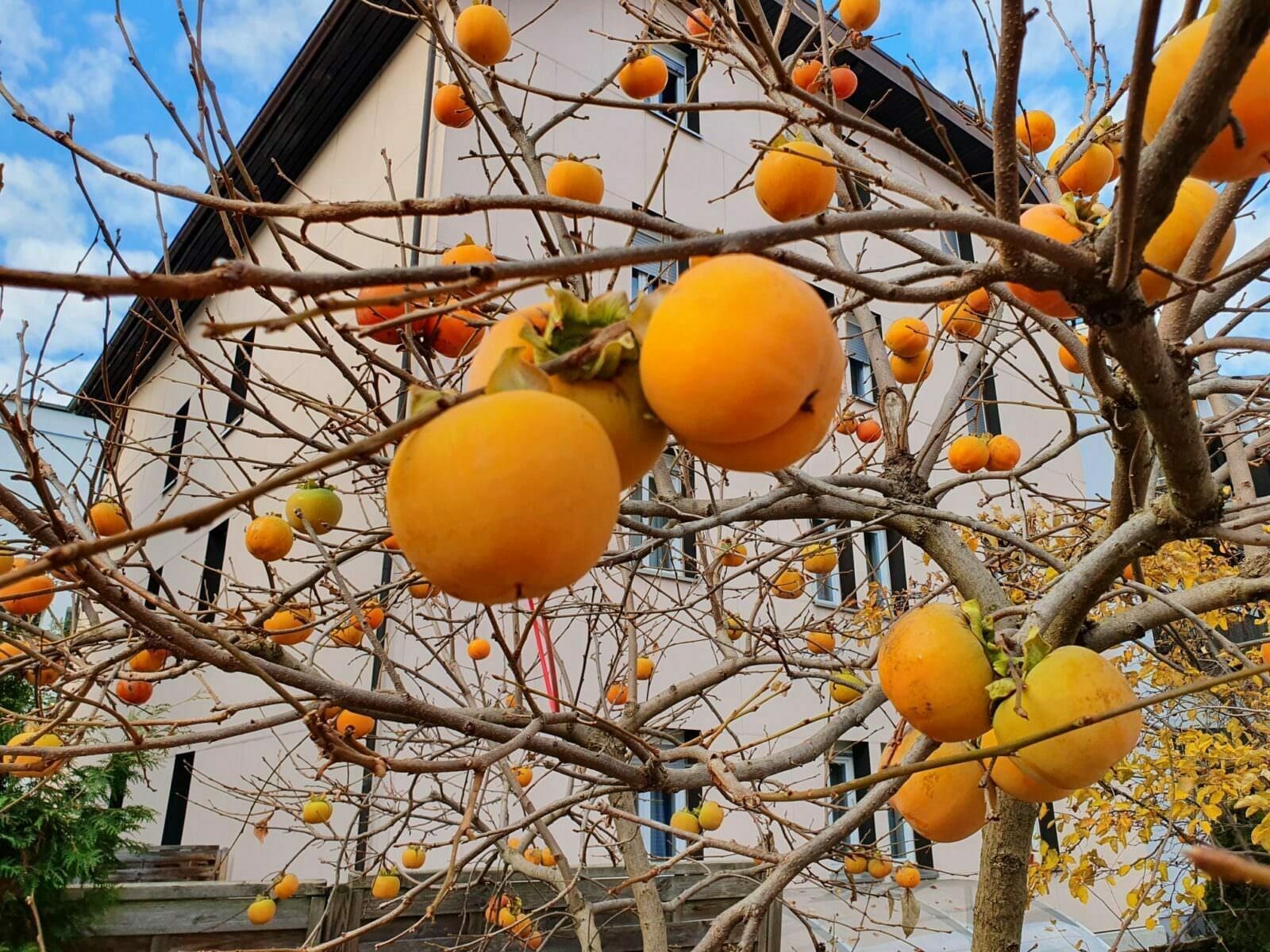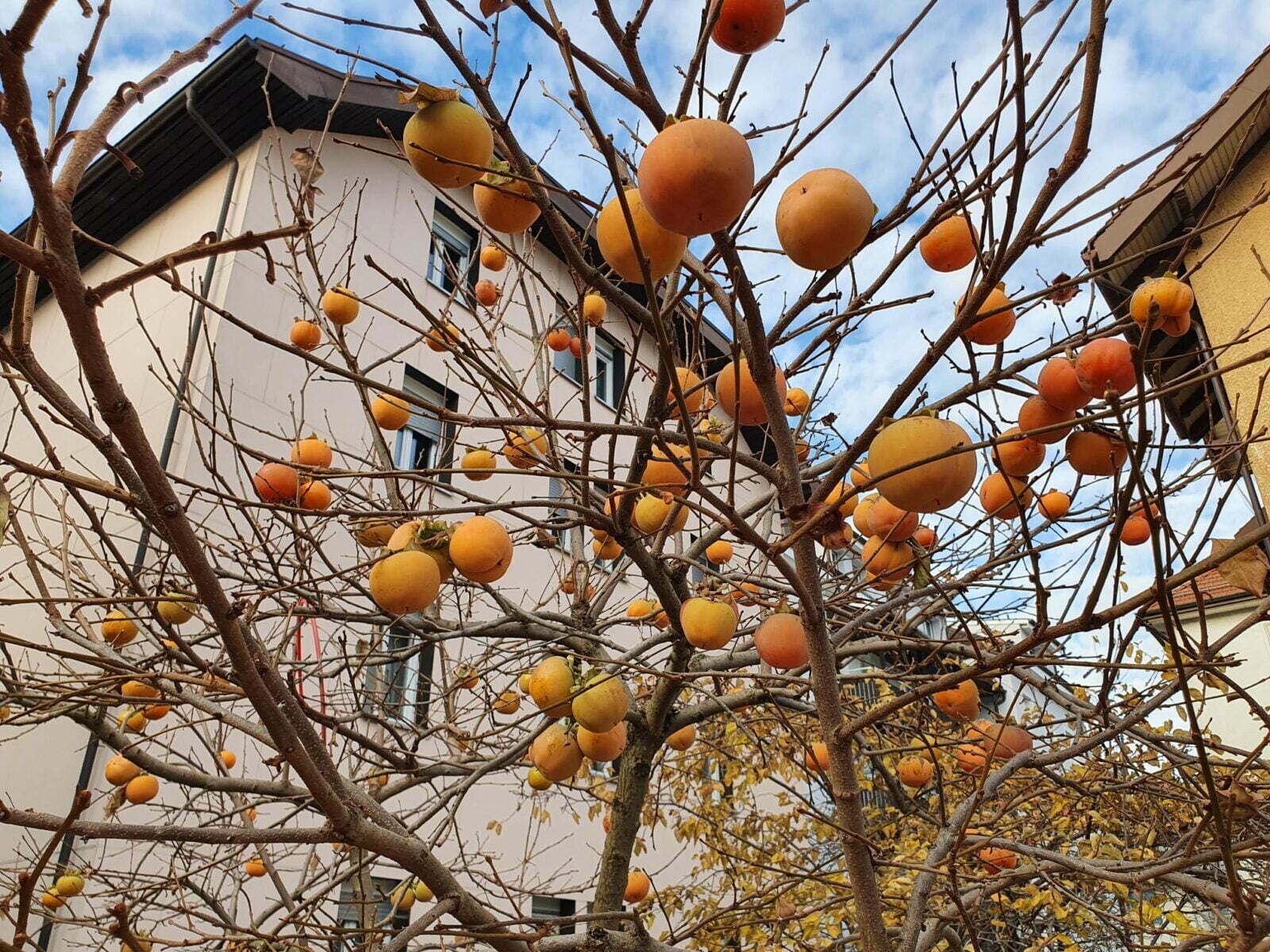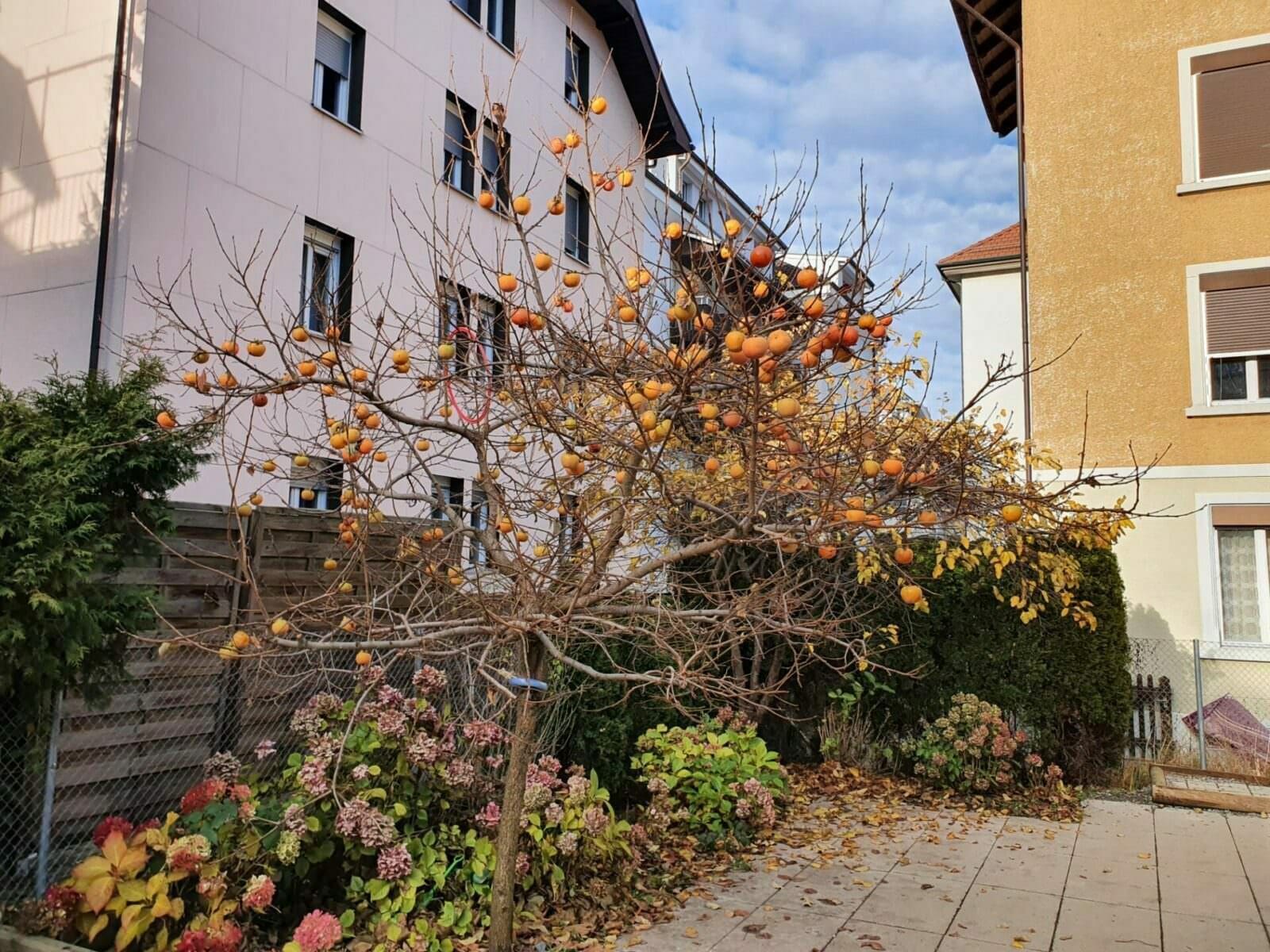 Nebst den vielen konventionellen Christbäumen erfreut Jahr für Jahr ein Baum mit gelb-orangen Christbaumkugeln das Gärtnerherz. Gut geschützt gedeiht ein «Diospyros kaki», besser bekannt als Kakibaum in unserem Städtchen.