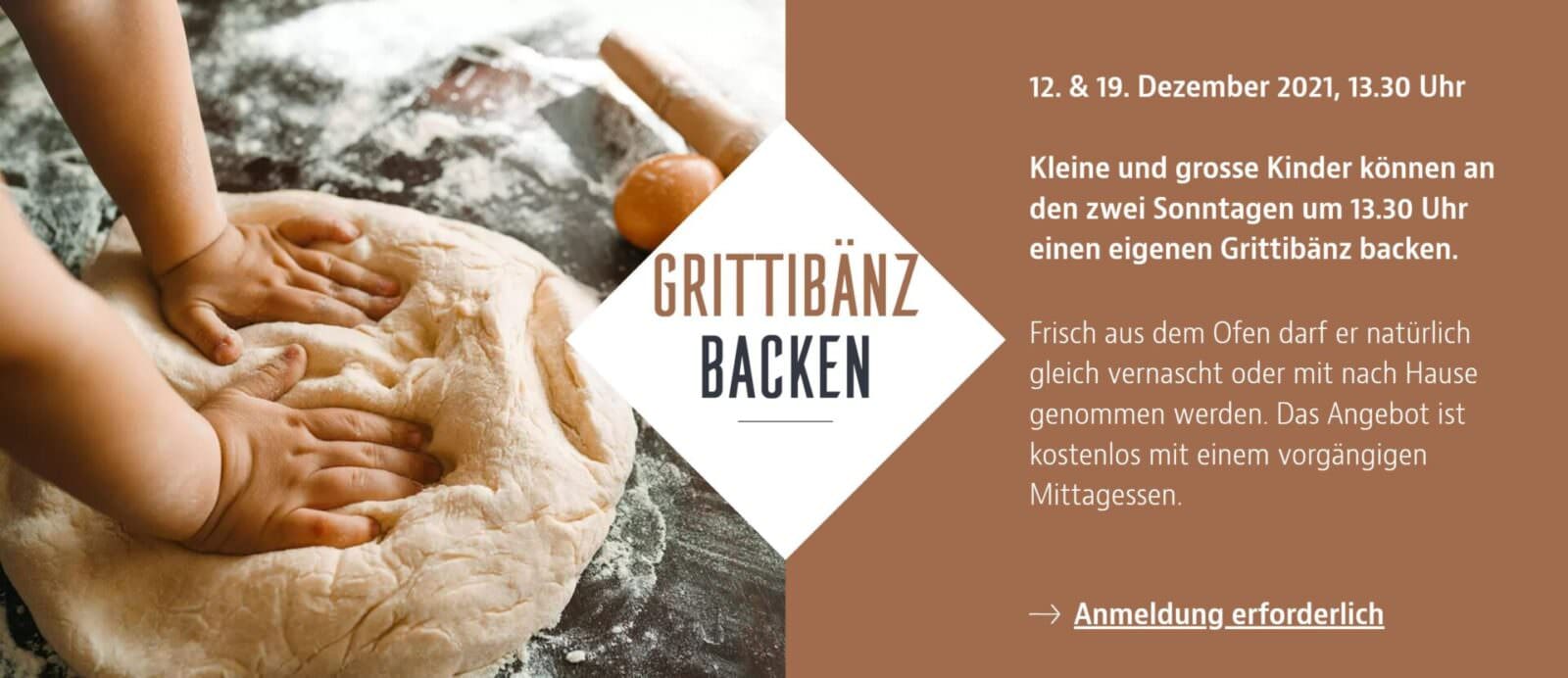 Kleine und grosse Kinder können kommenden Sonntag, 19. Dezember 2021, um 13.30 Uhr einen eigenen Grittibänz backen. Frisch aus dem Ofen darf er natürlich gleich vernascht oder mit nach Hause genommen werden. Das Angebot ist kostenlos mit einem vorgängigen Mittagessen. Eine Anmeldung ist erforderlich.