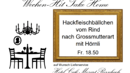 Aus Mariannes Küche gibt es heute Mittwoch:: Tagessuppe (4dl) mit Brot für Fr. 6.50 Saftiges Schweinsvoressen mit hausgemachtem Kartoffelstampf für Fr. 13.- Bestellung für den Mittag bis 11.00 Uhr oder für…
