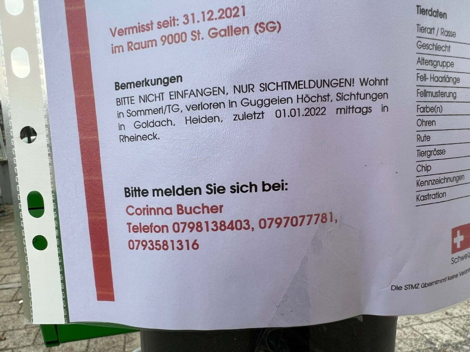 Da wird noch seit Silvester ein Hund vermisstThemen:Region 4. Januar 2022 - 05:05Die Suchzettel sind an der Rorschacher Seepromenade nicht zu übersehen. Die Kontaktdaten der Hundehalterin findet man unten. Teilen mit: Einen Link per E-Mail an einen Freund senden (Wird in neuem Fenster geöffnet) E-Mail Drucken (Wird in neuem Fenster geöffnet) Drucken Auf Facebook teilen (Wird in neuem Fenster geöffnet) Facebook Auf X teilen (Wird in neuem Fenster geöffnet) X Auf WhatsApp teilen (Wird in neuem Fenster geöffnet) WhatsApp Gefällt mir:Gefällt mir Wird geladen …Newsletter abonnieren Bitte dieses Feld leer lassenBitte wähle, ob Du über jeden neuen Beitrag sofort oder lieber jeden Morgen gegen 9 Uhr eine Zusammenfassung der neusten Beiträge erhalten möchtest.Liste(n) auswählen: Neues vom Echo (Zusammenfassung) Neues vom Echo (Sofortbenachrichtigung) Dieses Feld wird benötigt.Prüfen Sie Ihren Posteingang und den Spamordner, um Ihr Abonnement zu bestätigen.