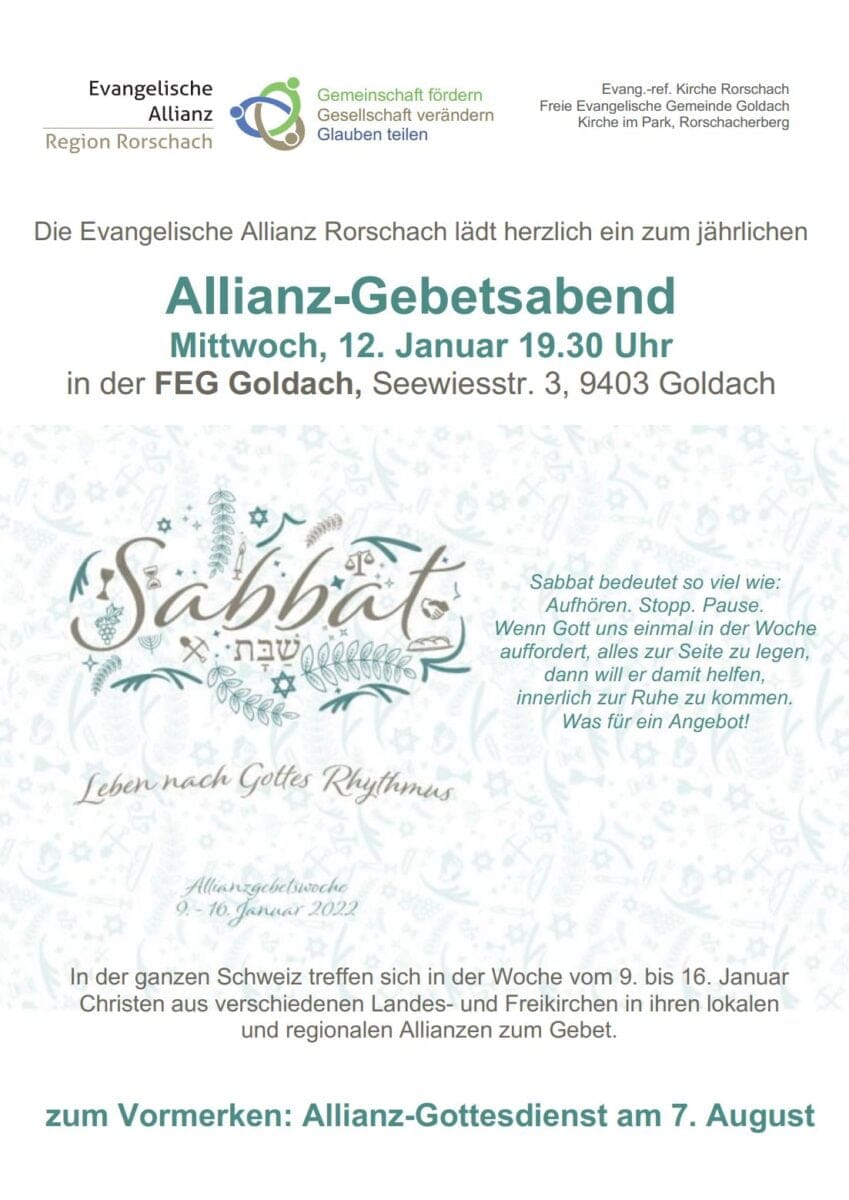 In der ganzen Schweiz treffen sich in dieser Woche Christen aus verschiedenen Landes- und Freikirchen in ihren lokalen und regionalen Allianzen zum Gebet. Interessierte beten morgen Mittwoch (12.01.22) ab 19.30 Uhr gemeinsam in der FEG Goldach an der Seewiesstrasse 3. Alle sind herzlich eingeladen.