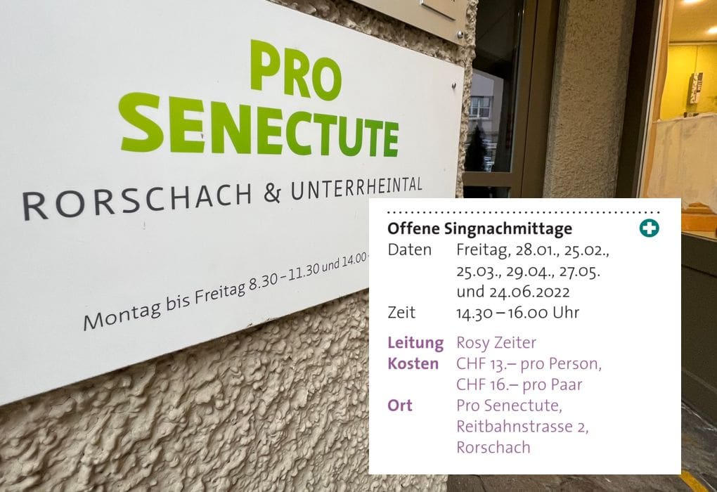 Morgen Freitag, 28. Januar 2022, von 14.30 Uhr – 16.00 Uhr: Offenes Singen mit Rosy Zeiter in der Pro Senectute in Rorschach an der Reitbahnstrasse 2. Kosten Fr. 13.–. Anmeldung: nicht notwendig. Es gelten die allgemeinen Corona-Schutzmassnahmen. Weitere Angebote der Pro Senectute Rorschach finden Interessierte hier.