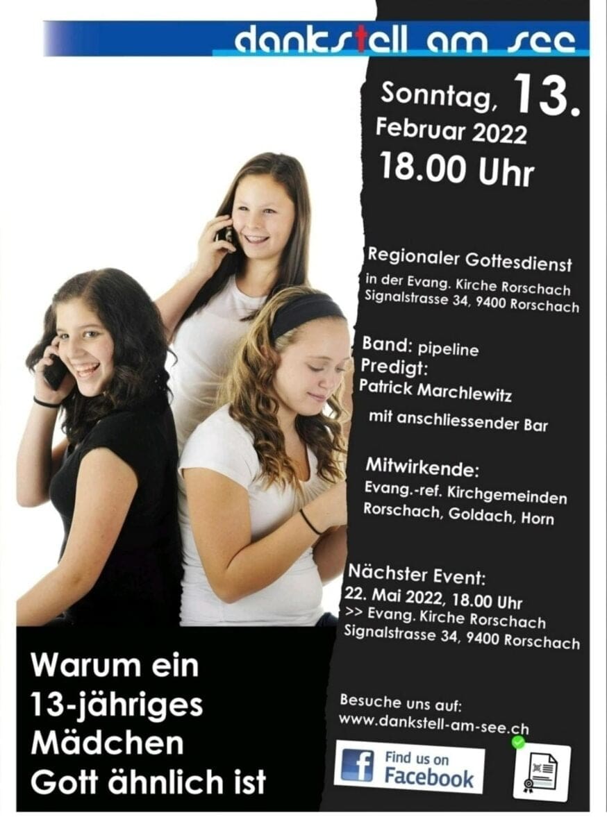 dankstell am see – Der andere Abendgottesdienst: Morgen Sonntag, 13. Februar 2022, ab 18 Uhr in der Evang. Kirche Rorschach. Für Jugendliche und junge Erwachsene mit der Band „pipeline“ und anschliessender Bar in der Evangelischen Kirche Rorschach.
