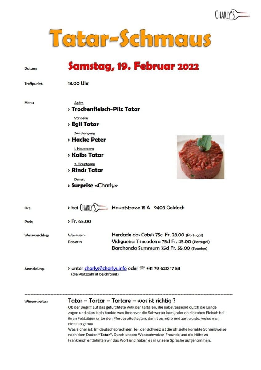 Charly lädt am Samstag zum Tatar-SchmausThemen:BeizenGoldachKultur 14. Februar 2022 - 05:05Man trifft sich am Samstag, 19. Februar 2022, ab 18 Uhr im „Charly’s“ an der Hauptstrasse 18A in Goldach. Da die Platzzahl beschränkt ist wird eine Anmeldung empfohlen. Entweder per Mail oder auf 079 620 17 53.Teilen mit: Einen Link per E-Mail an einen Freund senden (Wird in neuem Fenster geöffnet) E-Mail Drucken (Wird in neuem Fenster geöffnet) Drucken Auf Facebook teilen (Wird in neuem Fenster geöffnet) Facebook Auf X teilen (Wird in neuem Fenster geöffnet) X Auf WhatsApp teilen (Wird in neuem Fenster geöffnet) WhatsApp Gefällt mir:Gefällt mir Wird geladen …Newsletter abonnieren Bitte dieses Feld leer lassenBitte wähle, ob Du über jeden neuen Beitrag sofort oder lieber jeden Morgen gegen 9 Uhr eine Zusammenfassung der neusten Beiträge erhalten möchtest.Liste(n) auswählen: Neues vom Echo (Zusammenfassung) Neues vom Echo (Sofortbenachrichtigung) Dieses Feld wird benötigt.Prüfen Sie Ihren Posteingang und den Spamordner, um Ihr Abonnement zu bestätigen.