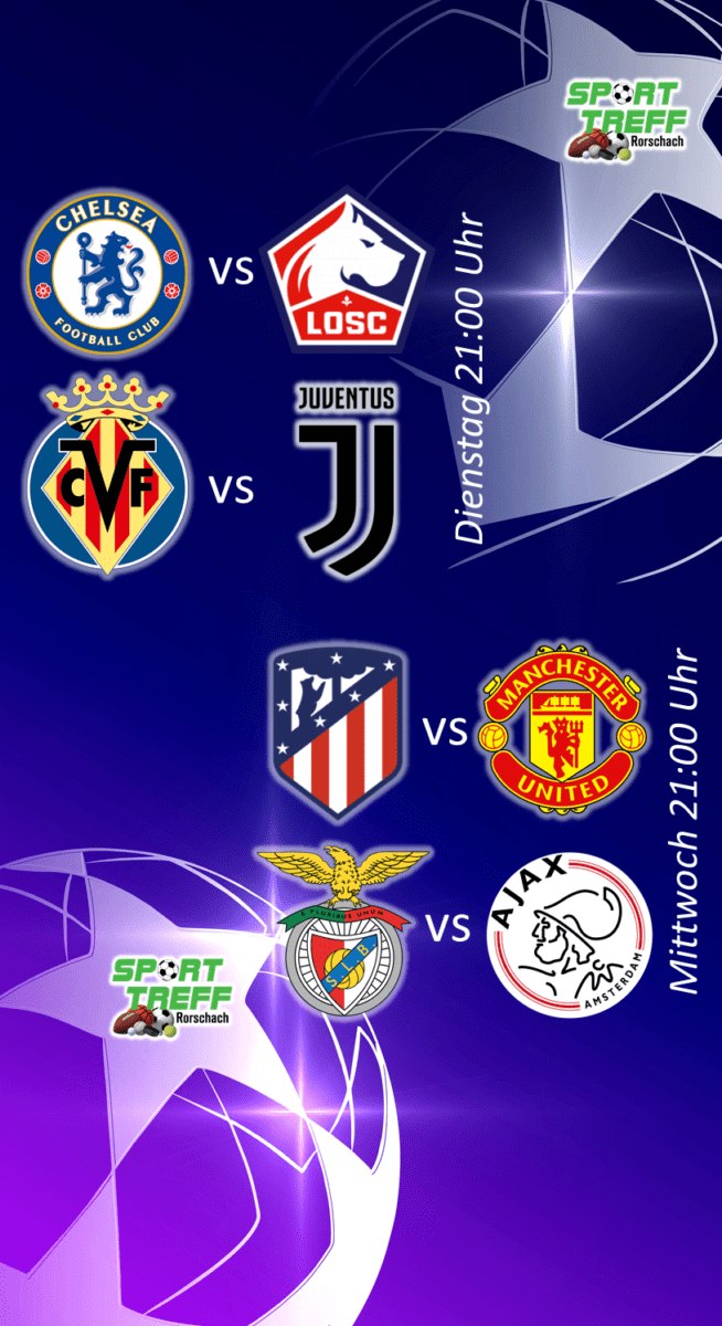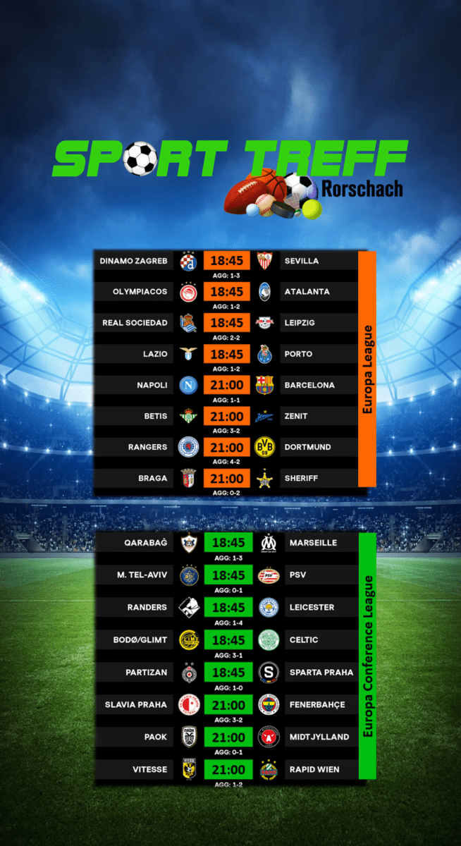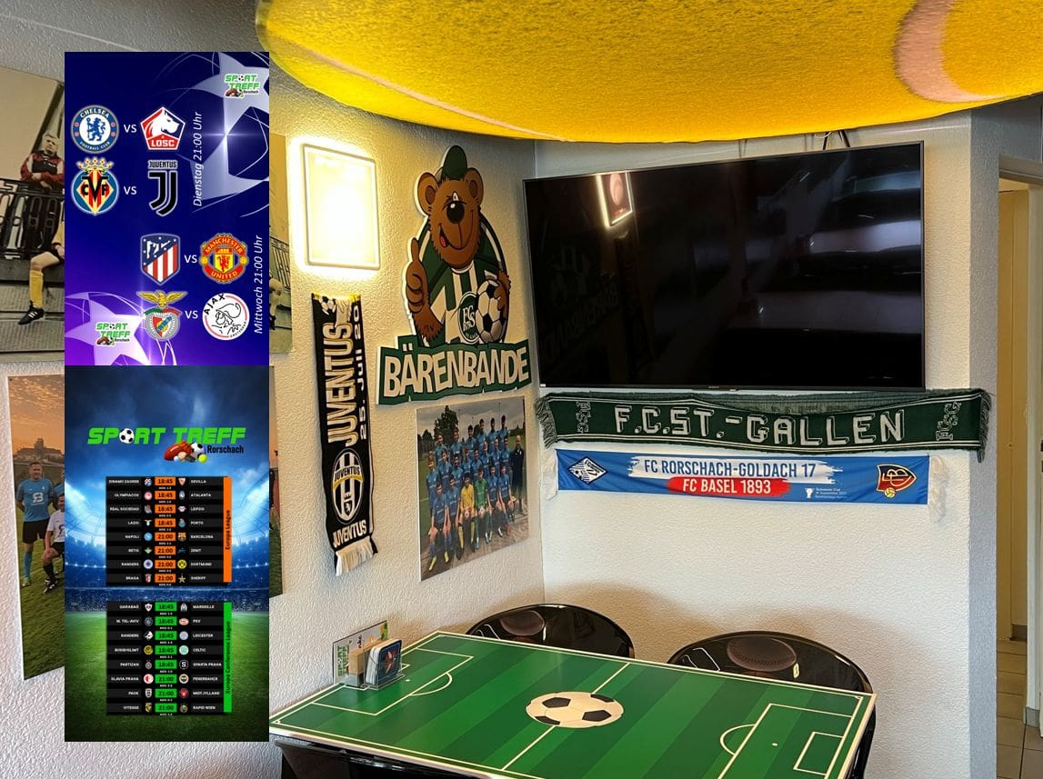 Heute und morgen ab 21 Uhr Champions League. Am Donnerstag Europa League und Europa Conference League (ab 18.45 und 21 Uhr). Live im SportTreff in Rorschach. Nur hingehen muss man selber…