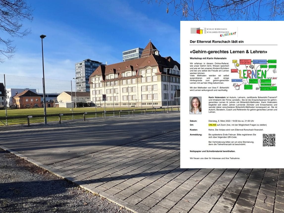 Elternrat Rorschach lädt zum Online-MeetingThemen:KulturRorschach 23. Februar 2022 - 05:05Thema ist „Gehirn-gerechtes Lernen und Lehren“. Man muss sich aber bis spätestens Ende Februar anmelden. Die wichtigsten Infos finden Interessierte auf dem Flyer unten:Teilen mit: Klicken, um einem Freund einen Link per E-Mail zu senden (Wird in neuem Fenster geöffnet) E-Mail Klicken zum Ausdrucken (Wird in neuem Fenster geöffnet) Drucken Klick, um auf Facebook zu teilen (Wird in neuem Fenster geöffnet) Facebook Klicke, um auf X zu teilen (Wird in neuem Fenster geöffnet) X Klicken, um auf WhatsApp zu teilen (Wird in neuem Fenster geöffnet) WhatsApp Gefällt mir:Gefällt mir Wird geladen …Newsletter abonnieren Bitte dieses Feld leer lassenBitte wähle, ob Du über jeden neuen Beitrag sofort oder lieber jeden Morgen gegen 9 Uhr eine Zusammenfassung der neusten Beiträge erhalten möchtest.Liste(n) auswählen: Neues vom Echo (Zusammenfassung) Neues vom Echo (Sofortbenachrichtigung) Dieses Feld wird benötigt.Prüfen Sie Ihren Posteingang und den Spamordner, um Ihr Abonnement zu bestätigen.