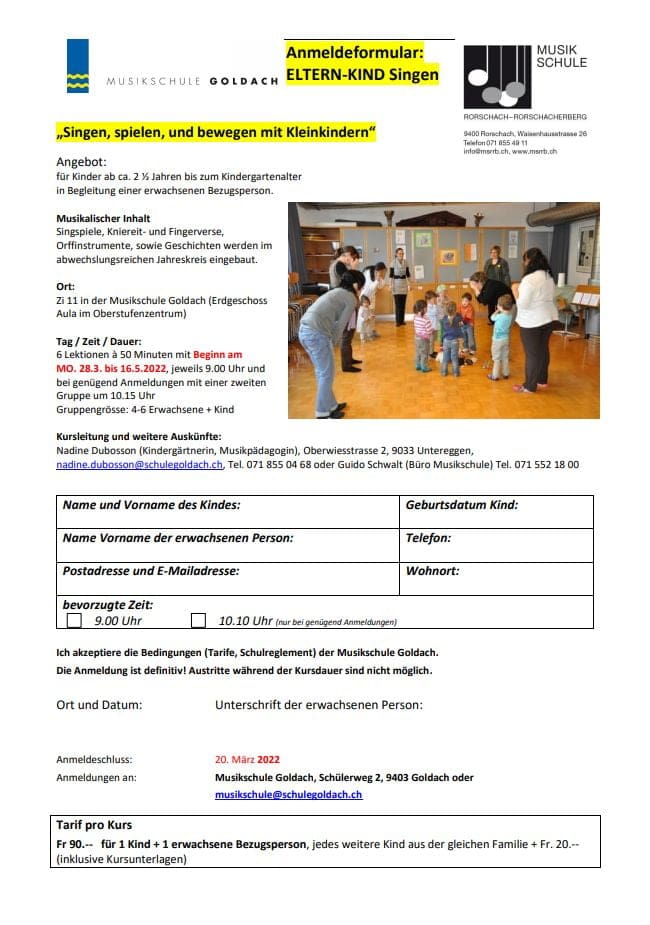 Beginn ist am Montag, 28. März. (Anmeldeschluss: 20. März). Der Kurs beinhaltet Singspiele, Kniereit- und Fingerverse, Orffinstrumente, sowie Geschichten aus dem abwechslungsreichen Jahreskreis. Die Kurse werden neu durch Frau Nadine Dubosson (Kindergärtnerin, Musikpädagogin) geleitet.