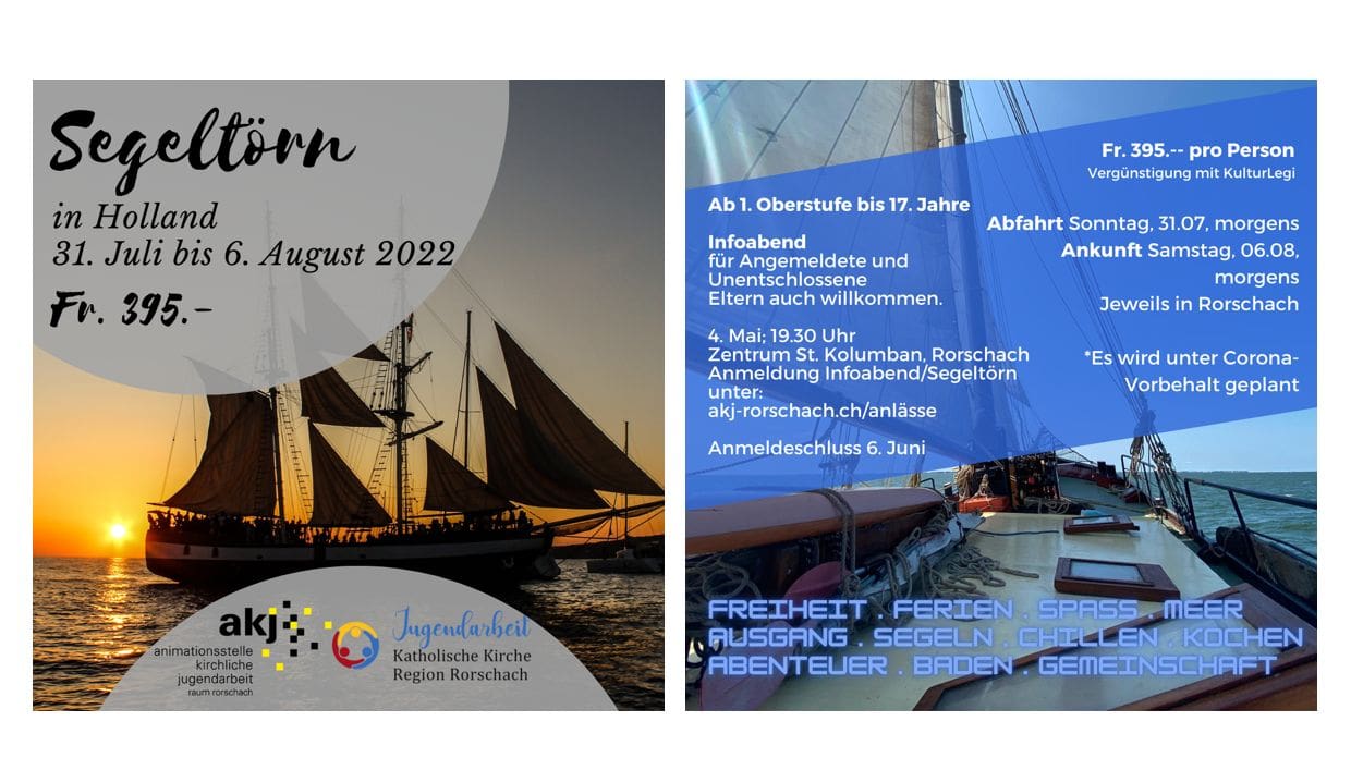 „Hast du Lust auf ein cooles Abenteuer? Dann komm mit nach Holland! Wir setzen im Hafen von Amsterdam die Segel und gestalten gemeinsam als Gruppe sechs Tage mit Segeln, Ausflügen, Kochen und vielem mehr. Interesse? Dann melde dich an oder komm an unseren Infoabend! Interessierte Jugendliche sowie Eltern sind herzlich eingeladen“, schreibt Jugendarbeiterin Marla Pires. Weitere Informationen bei Philipp Wirth; info@akj-rorschach.ch, 071 841 45 51 oder marla.pires@kkrr.ch; 079 524 77 48 oder auf Instagram: @jugendarbeit_kkrr / @akj_raum_rorschach.