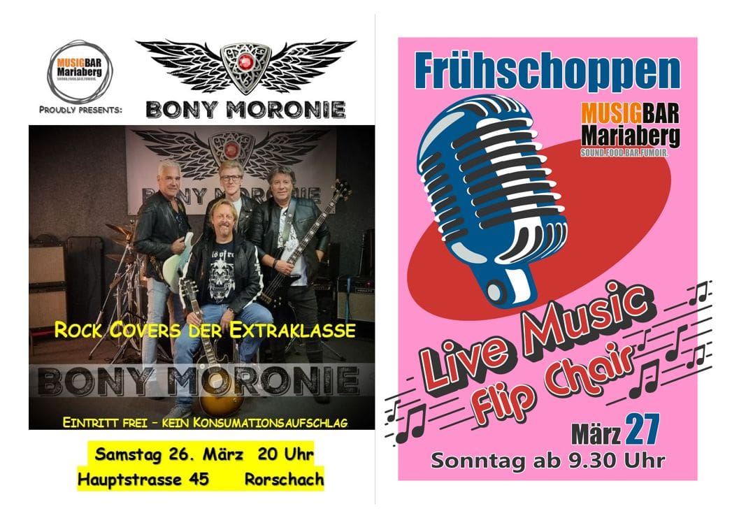 Die nächsten beiden Mariaberg-Konzerte in SichtThemen:BeizenKulturRorschach 22. März 2022 - 05:05Kommenden Samstag spielen Bony Moronie auf der Mariaberg-Bühne und wie immer am letzten Sonntag im Monat rocken ab 09.30 Uhr Flip-chair den Laden… Teilen mit: Klicken, um einem Freund einen Link per E-Mail zu senden (Wird in neuem Fenster geöffnet) E-Mail Klicken zum Ausdrucken (Wird in neuem Fenster geöffnet) Drucken Klick, um auf Facebook zu teilen (Wird in neuem Fenster geöffnet) Facebook Klicke, um auf X zu teilen (Wird in neuem Fenster geöffnet) X Klicken, um auf WhatsApp zu teilen (Wird in neuem Fenster geöffnet) WhatsApp Gefällt mir:Gefällt mir Wird geladen …Newsletter abonnieren Bitte dieses Feld leer lassenBitte wähle, ob Du über jeden neuen Beitrag sofort oder lieber jeden Morgen gegen 9 Uhr eine Zusammenfassung der neusten Beiträge erhalten möchtest.Liste(n) auswählen: Neues vom Echo (Zusammenfassung) Neues vom Echo (Sofortbenachrichtigung) Dieses Feld wird benötigt.Prüfen Sie Ihren Posteingang und den Spamordner, um Ihr Abonnement zu bestätigen.