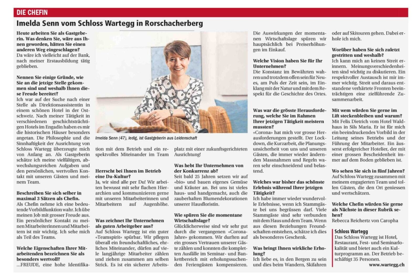 Die kennen wir doch…Themen:RorschacherbergSchloss Wartegg 31. März 2022 - 17:55Imelda Senn vom Schloss Wartegg ist heute in den Bodensee Nachrichten „Die Chefin…“.Teilen mit: Einen Link per E-Mail an einen Freund senden (Wird in neuem Fenster geöffnet) E-Mail Drucken (Wird in neuem Fenster geöffnet) Drucken Auf Facebook teilen (Wird in neuem Fenster geöffnet) Facebook Auf X teilen (Wird in neuem Fenster geöffnet) X Auf WhatsApp teilen (Wird in neuem Fenster geöffnet) WhatsApp Gefällt mir:Gefällt mir Wird geladen …Newsletter abonnieren Bitte dieses Feld leer lassenBitte wähle, ob Du über jeden neuen Beitrag sofort oder lieber jeden Morgen gegen 9 Uhr eine Zusammenfassung der neusten Beiträge erhalten möchtest.Liste(n) auswählen: Neues vom Echo (Zusammenfassung) Neues vom Echo (Sofortbenachrichtigung) Dieses Feld wird benötigt.Prüfen Sie Ihren Posteingang und den Spamordner, um Ihr Abonnement zu bestätigen.