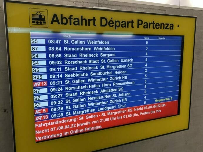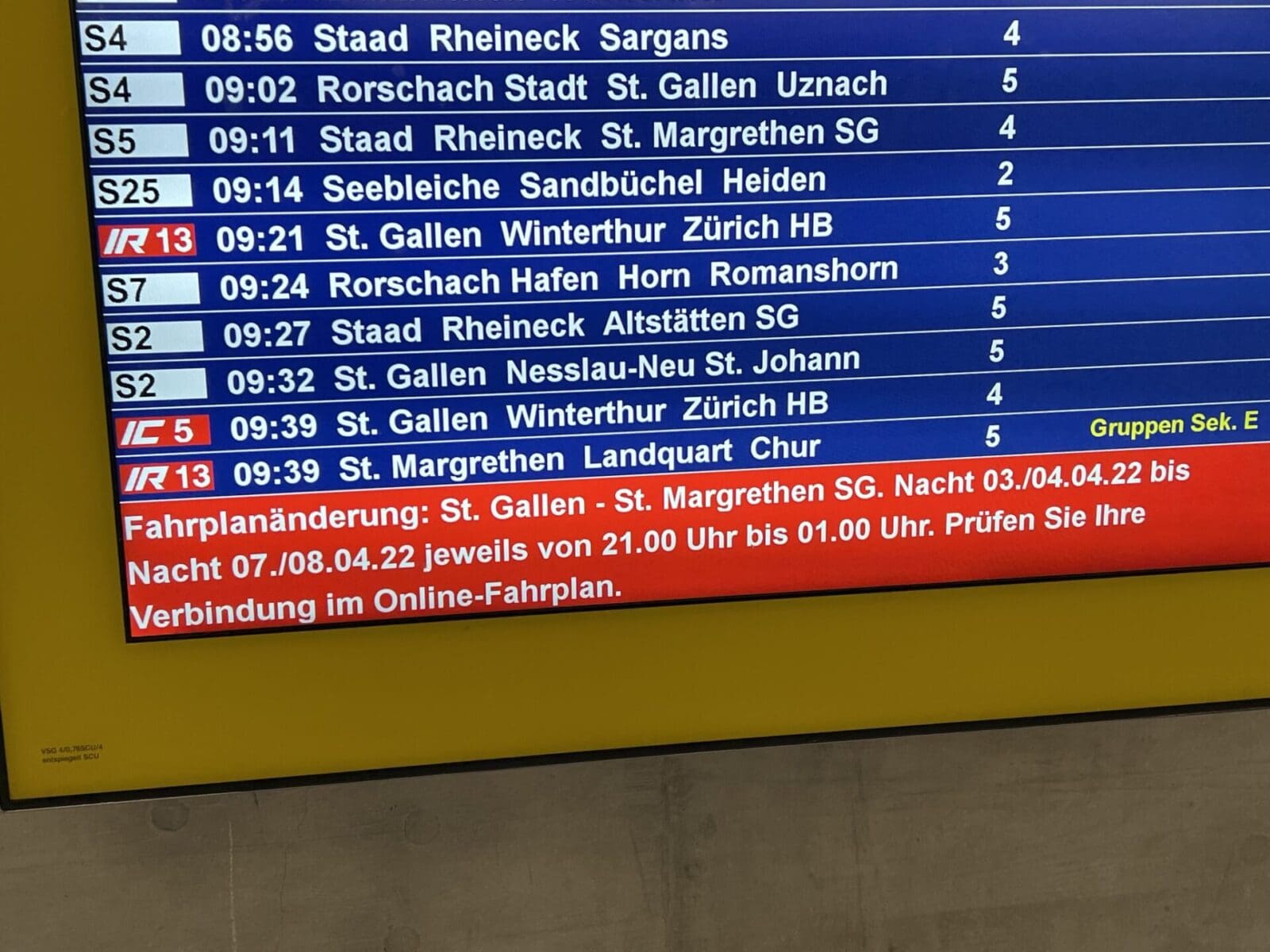 In den kommenden Nächten den Fahrplan anschauenThemen:Rorschach 3. April 2022 - 05:09Die SBB macht da wieder was. Deshalb lohnt es sich, in den kommenden Nächten ab 21 Uhr den Fahrplan zu kontrollieren.Teilen mit: Einen Link per E-Mail an einen Freund senden (Wird in neuem Fenster geöffnet) E-Mail Drucken (Wird in neuem Fenster geöffnet) Drucken Auf Facebook teilen (Wird in neuem Fenster geöffnet) Facebook Auf X teilen (Wird in neuem Fenster geöffnet) X Auf WhatsApp teilen (Wird in neuem Fenster geöffnet) WhatsApp Gefällt mir:Gefällt mir Wird geladen …Newsletter abonnieren Bitte dieses Feld leer lassenBitte wähle, ob Du über jeden neuen Beitrag sofort oder lieber jeden Morgen gegen 9 Uhr eine Zusammenfassung der neusten Beiträge erhalten möchtest.Liste(n) auswählen: Neues vom Echo (Zusammenfassung) Neues vom Echo (Sofortbenachrichtigung) Dieses Feld wird benötigt.Prüfen Sie Ihren Posteingang und den Spamordner, um Ihr Abonnement zu bestätigen.