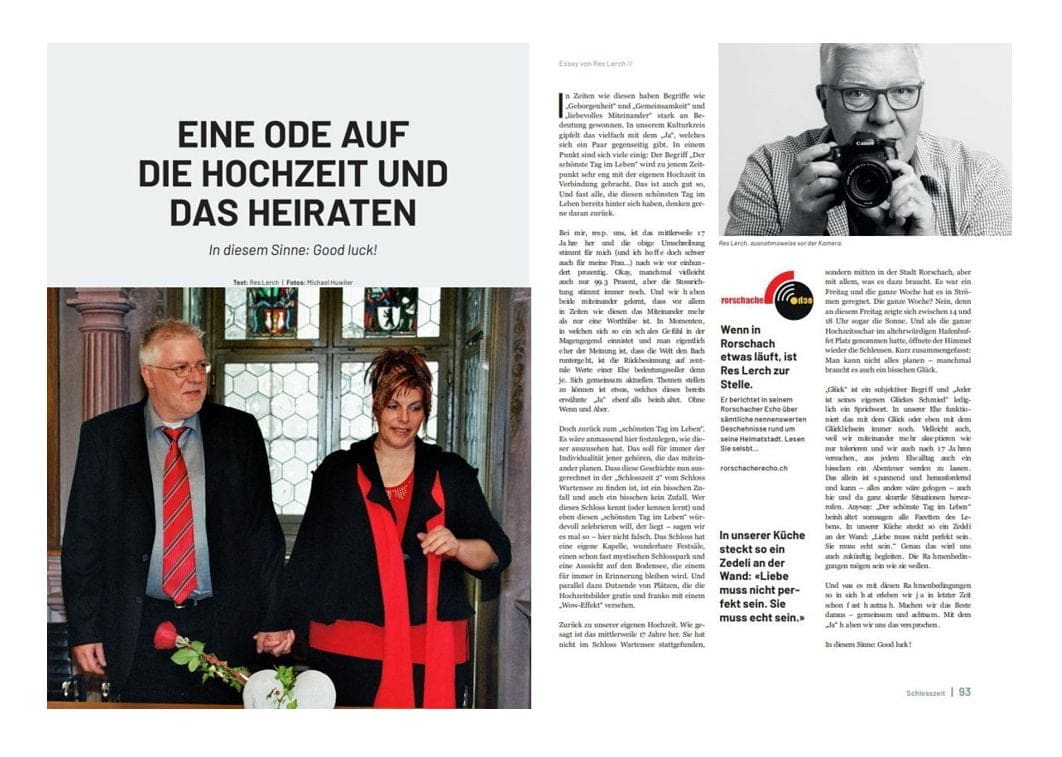 Doch zurück zum „schönsten Tag im Leben“. Es wäre anmassend hier festzulegen, wie dieser auszusehen hat. Das soll für immer der Individualität jener gehören, die das miteinander planen. Dass diese Geschichte nun ausgerechnet in der „Schlosszeit 2“ vom Schloss Wartensee zu finden ist, ist ein bisschen Zufall und auch ein bisschen kein Zufall. Wer dieses Schloss kennt (oder kennen lernt) und eben diesen „schönsten Tag im Leben“ würdevoll zelebrieren will, der liegt – sagen wir es mal so – hier nicht falsch. Das Schloss hat eine eigene Kapelle, wunderbare Festsäle, einen schon fast mystischen Schlosspark und eine Aussicht auf den Bodensee, die einem für immer in Erinnerung bleiben wird. Und parallel dazu Dutzende von Plätzen, die die Hochzeitsbilder gratis und franko mit einem „Wow-Effekt“ versehen. Zurück zu unserer eigenen Hochzeit. Wie gesagt ist das mittlerweile 17 Jahre her. Sie hat nicht im Schloss Wartensee stattgefunden, sondern mitten in der Stadt Rorschach, aber mit allem, was es dazu braucht.