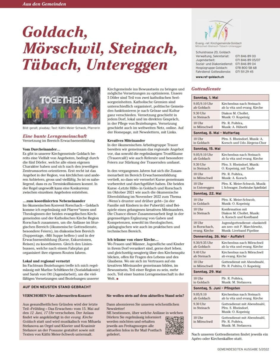 Das Angebot von Ref. Goldach im MaiThemen:GoldachKulturPartnerRegion 30. April 2022 - 05:15Das vielseitige Angebot der Evang.-ref. Kirchgemeinde Goldach und Umgebung finden Interessierte auch hier. Die Hinweise zum morgigen Sonntag gibt es hier. Teilen mit: Klicken, um einem Freund einen Link per E-Mail zu senden (Wird in neuem Fenster geöffnet) E-Mail Klicken zum Ausdrucken (Wird in neuem Fenster geöffnet) Drucken Klick, um auf Facebook zu teilen (Wird in neuem Fenster geöffnet) Facebook Klicke, um auf X zu teilen (Wird in neuem Fenster geöffnet) X Klicken, um auf WhatsApp zu teilen (Wird in neuem Fenster geöffnet) WhatsApp Gefällt mir:Gefällt mir Wird geladen …Newsletter abonnieren Bitte dieses Feld leer lassenBitte wähle, ob Du über jeden neuen Beitrag sofort oder lieber jeden Morgen gegen 9 Uhr eine Zusammenfassung der neusten Beiträge erhalten möchtest.Liste(n) auswählen: Neues vom Echo (Zusammenfassung) Neues vom Echo (Sofortbenachrichtigung) Dieses Feld wird benötigt.Prüfen Sie Ihren Posteingang und den Spamordner, um Ihr Abonnement zu bestätigen.
