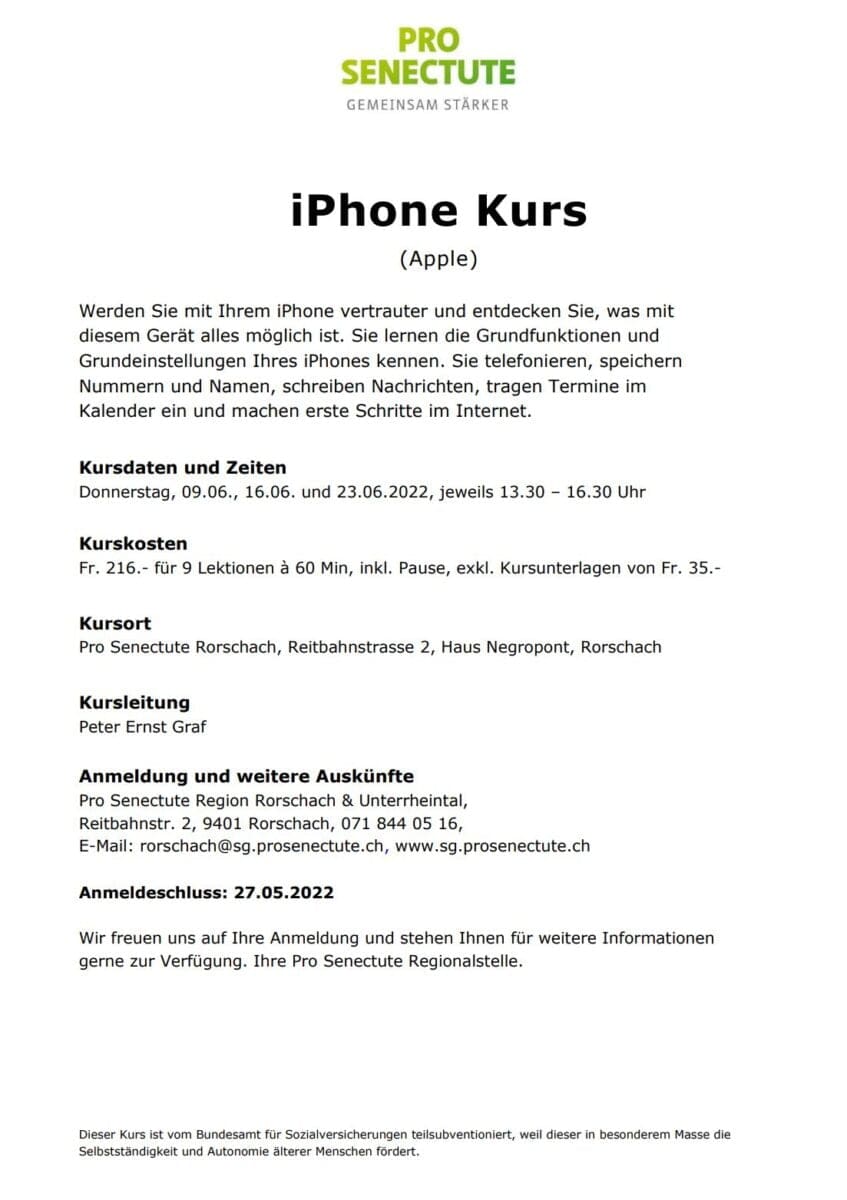 iPhone-Kurs der Pro Senectute startet am 9. JuniThemen:KulturRorschach 22. Mai 2022 - 05:18Details finden Interessierte auf dem Flyer unten. Anmeldeschluss ist der kommende Freitag, 27. Mai 2022. (Beitragsbild: pd ps)Teilen mit: Einen Link per E-Mail an einen Freund senden (Wird in neuem Fenster geöffnet) E-Mail Drucken (Wird in neuem Fenster geöffnet) Drucken Auf Facebook teilen (Wird in neuem Fenster geöffnet) Facebook Auf X teilen (Wird in neuem Fenster geöffnet) X Auf WhatsApp teilen (Wird in neuem Fenster geöffnet) WhatsApp Gefällt mir:Gefällt mir Wird geladen …Newsletter abonnieren Bitte dieses Feld leer lassenBitte wähle, ob Du über jeden neuen Beitrag sofort oder lieber jeden Morgen gegen 9 Uhr eine Zusammenfassung der neusten Beiträge erhalten möchtest.Liste(n) auswählen: Neues vom Echo (Zusammenfassung) Neues vom Echo (Sofortbenachrichtigung) Dieses Feld wird benötigt.Prüfen Sie Ihren Posteingang und den Spamordner, um Ihr Abonnement zu bestätigen.