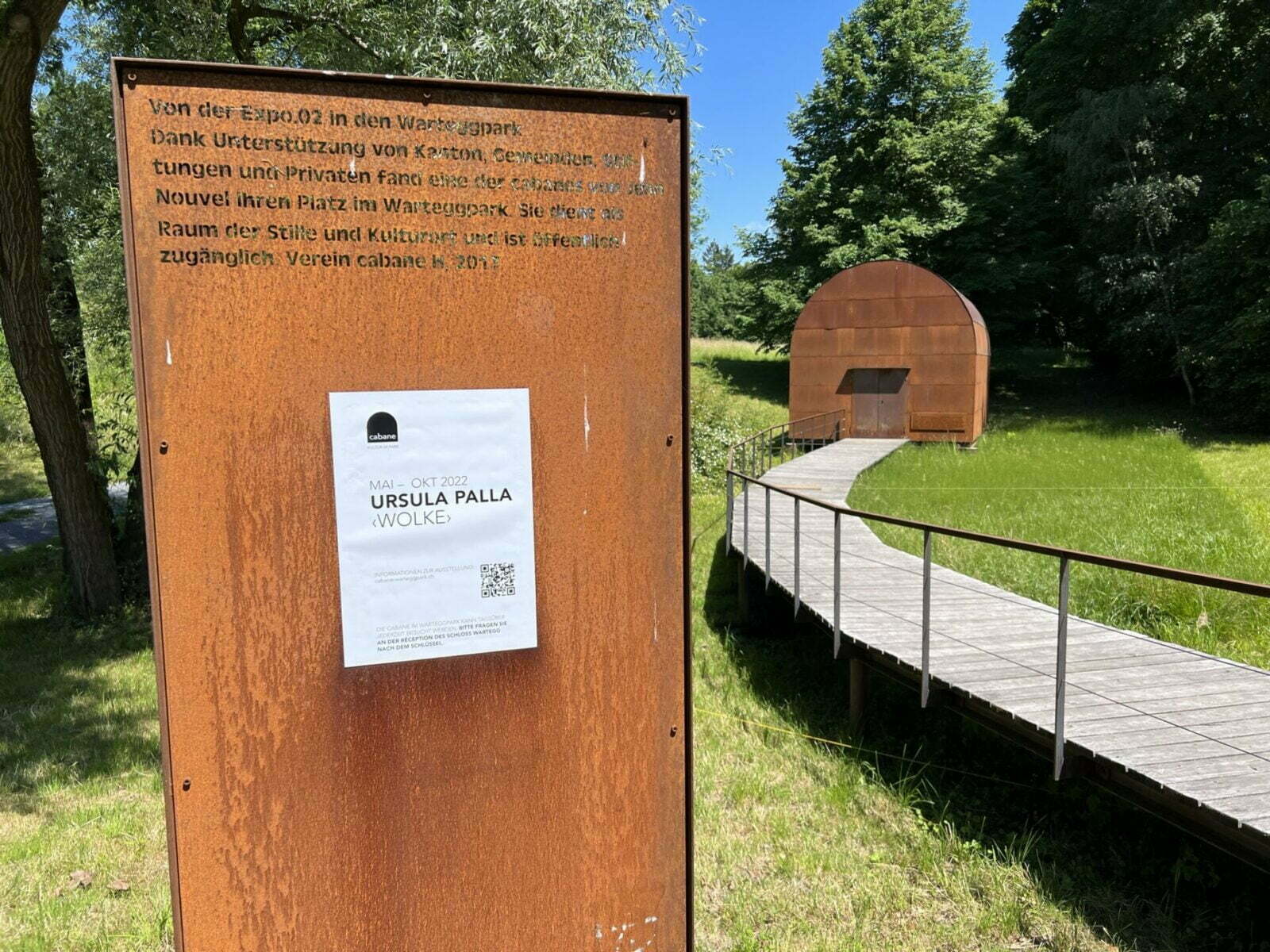 Die Installation von Ursula Palla ist noch bis Oktober 2022 täglich von 8 bis 20 Uhr in der Cabane im Warteggpark zu besichtigen. Der Schlüssel ist an der Reception im Schloss erhältlich.