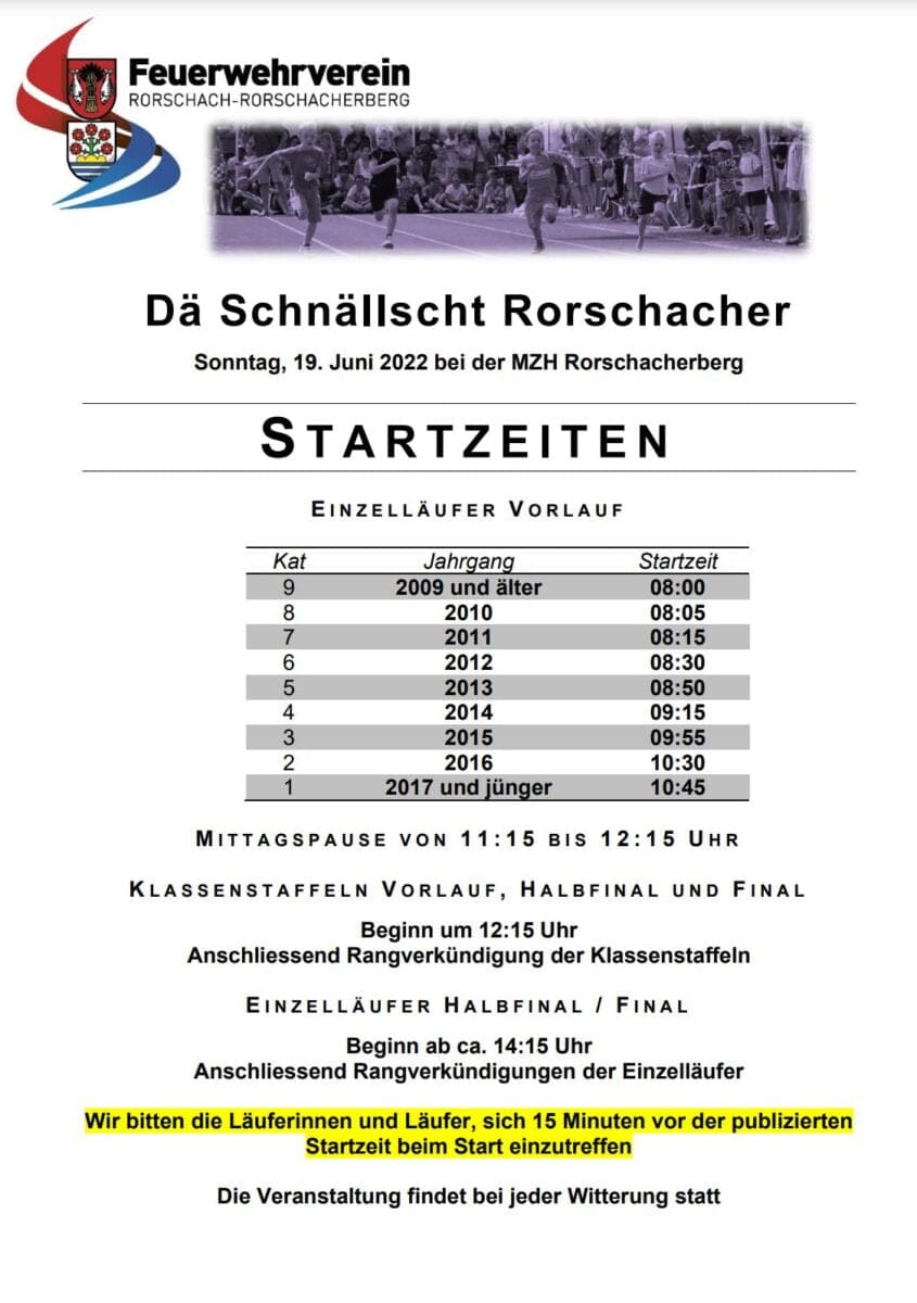 Nach zwei Jahren Zwangspause freut sich der Feuerwehrverein Rorschach-Rorschacherberg, morgen Sonntag, 19. Juni 2022 den Schülerwettlauf «Dä Schnällscht Rorschacher» auf der Sportanlage der Mehrzweckhalle Rorschacherberg wieder durchführen zu dürfen. Spannende Duelle, laufen um Bestzeiten und das gemeinsame Erlebnis sollen auch dieses Jahr wieder im Vordergrund stehen. Nachstehend die Termine: