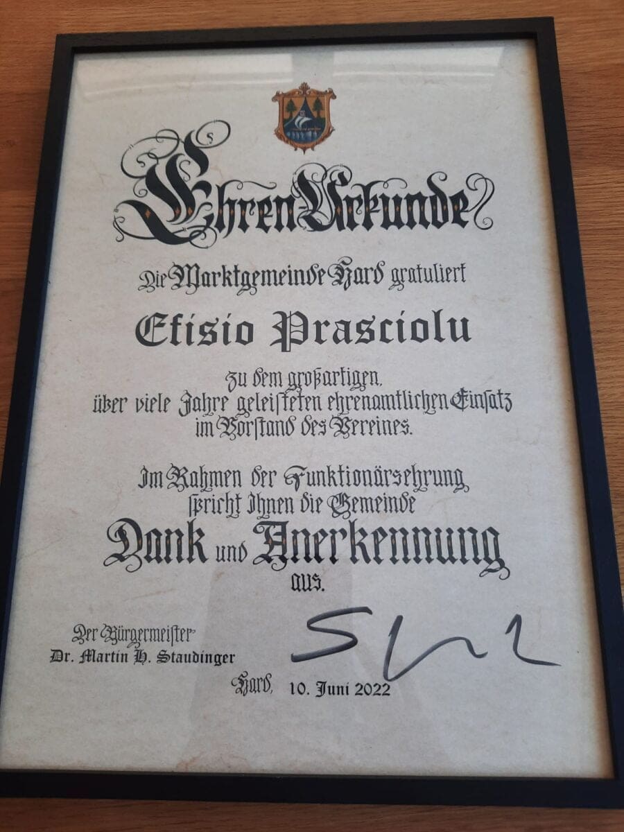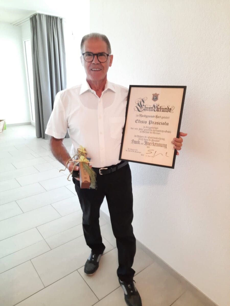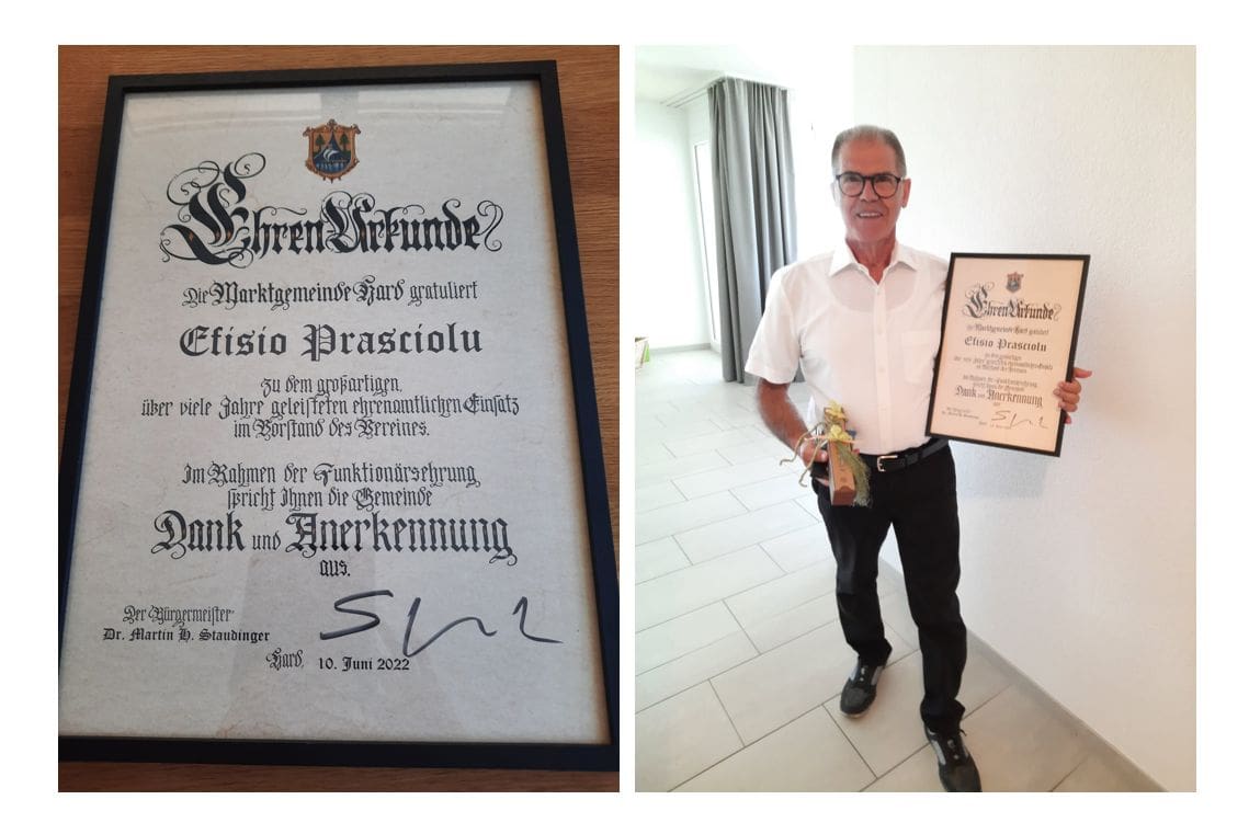 Eine weitere Auszeichnung für Efisio PrascioluThemen:Rorschacherberg 19. Juni 2022 - 05:09Hier einige Impressionen von der Verleihung in Hard, wo der in unserer Region bestens bekannte Efisio Prasciolu seit vielen Jahren tätig ist. Die Fotos wurden dem Rorschacher Echo zugeschickt. Herzlichen Dank. Teilen mit: Einen Link per E-Mail an einen Freund senden (Wird in neuem Fenster geöffnet) E-Mail Drucken (Wird in neuem Fenster geöffnet) Drucken Auf Facebook teilen (Wird in neuem Fenster geöffnet) Facebook Auf X teilen (Wird in neuem Fenster geöffnet) X Auf WhatsApp teilen (Wird in neuem Fenster geöffnet) WhatsApp Gefällt mir:Gefällt mir Wird geladen …Newsletter abonnieren Bitte dieses Feld leer lassenBitte wähle, ob Du über jeden neuen Beitrag sofort oder lieber jeden Morgen gegen 9 Uhr eine Zusammenfassung der neusten Beiträge erhalten möchtest.Liste(n) auswählen: Neues vom Echo (Zusammenfassung) Neues vom Echo (Sofortbenachrichtigung) Dieses Feld wird benötigt.Prüfen Sie Ihren Posteingang und den Spamordner, um Ihr Abonnement zu bestätigen.