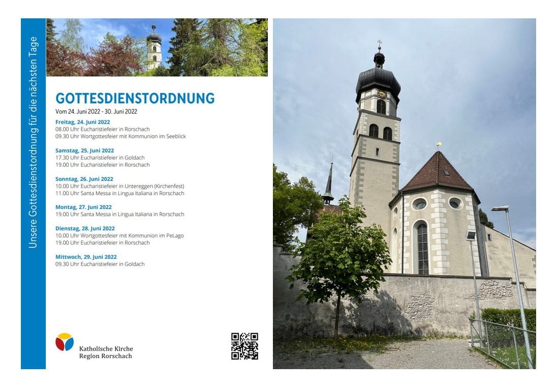 Gottesdienstordnung der KKRR für die nächsten TageThemen:Kath. RorschachKulturPartnerRegionRorschach 24. Juni 2022 - 05:20Gilt ab heute Freitag bis kommenden Donnerstag, 30. Juni 2022. Details finden Interessierte wie immer auch hier und hier.Teilen mit: Einen Link per E-Mail an einen Freund senden (Wird in neuem Fenster geöffnet) E-Mail Drucken (Wird in neuem Fenster geöffnet) Drucken Auf Facebook teilen (Wird in neuem Fenster geöffnet) Facebook Auf X teilen (Wird in neuem Fenster geöffnet) X Auf WhatsApp teilen (Wird in neuem Fenster geöffnet) WhatsApp Gefällt mir:Gefällt mir Wird geladen …Newsletter abonnieren Bitte dieses Feld leer lassenBitte wähle, ob Du über jeden neuen Beitrag sofort oder lieber jeden Morgen gegen 9 Uhr eine Zusammenfassung der neusten Beiträge erhalten möchtest.Liste(n) auswählen: Neues vom Echo (Zusammenfassung) Neues vom Echo (Sofortbenachrichtigung) Dieses Feld wird benötigt.Prüfen Sie Ihren Posteingang und den Spamordner, um Ihr Abonnement zu bestätigen.
