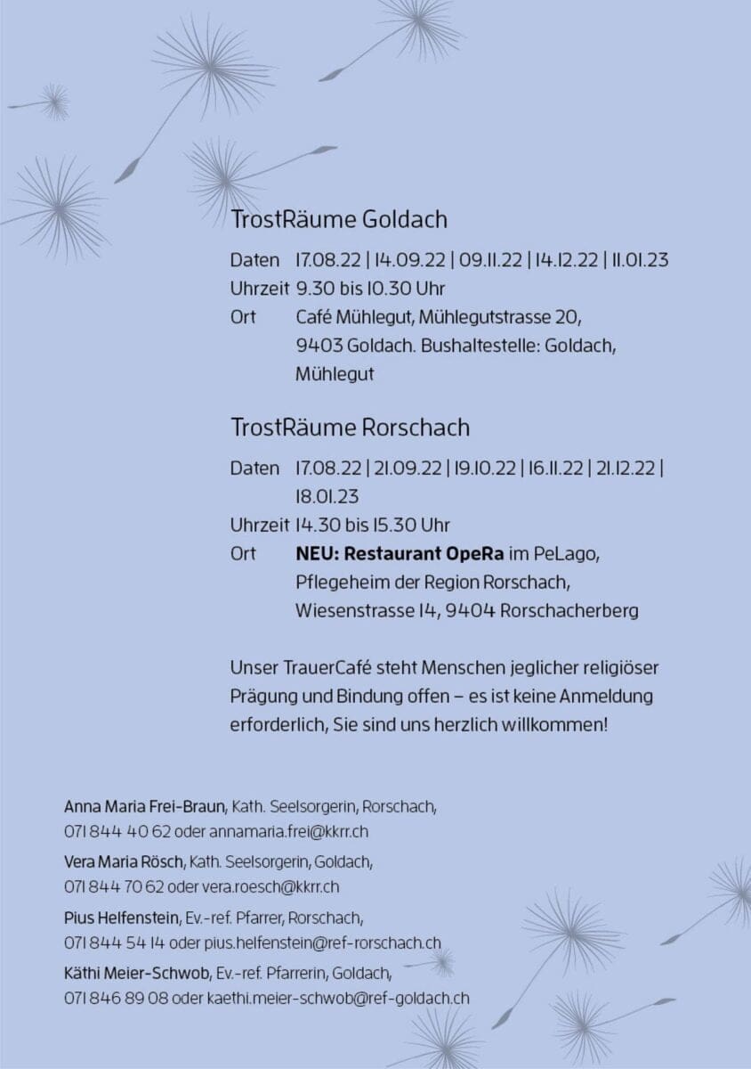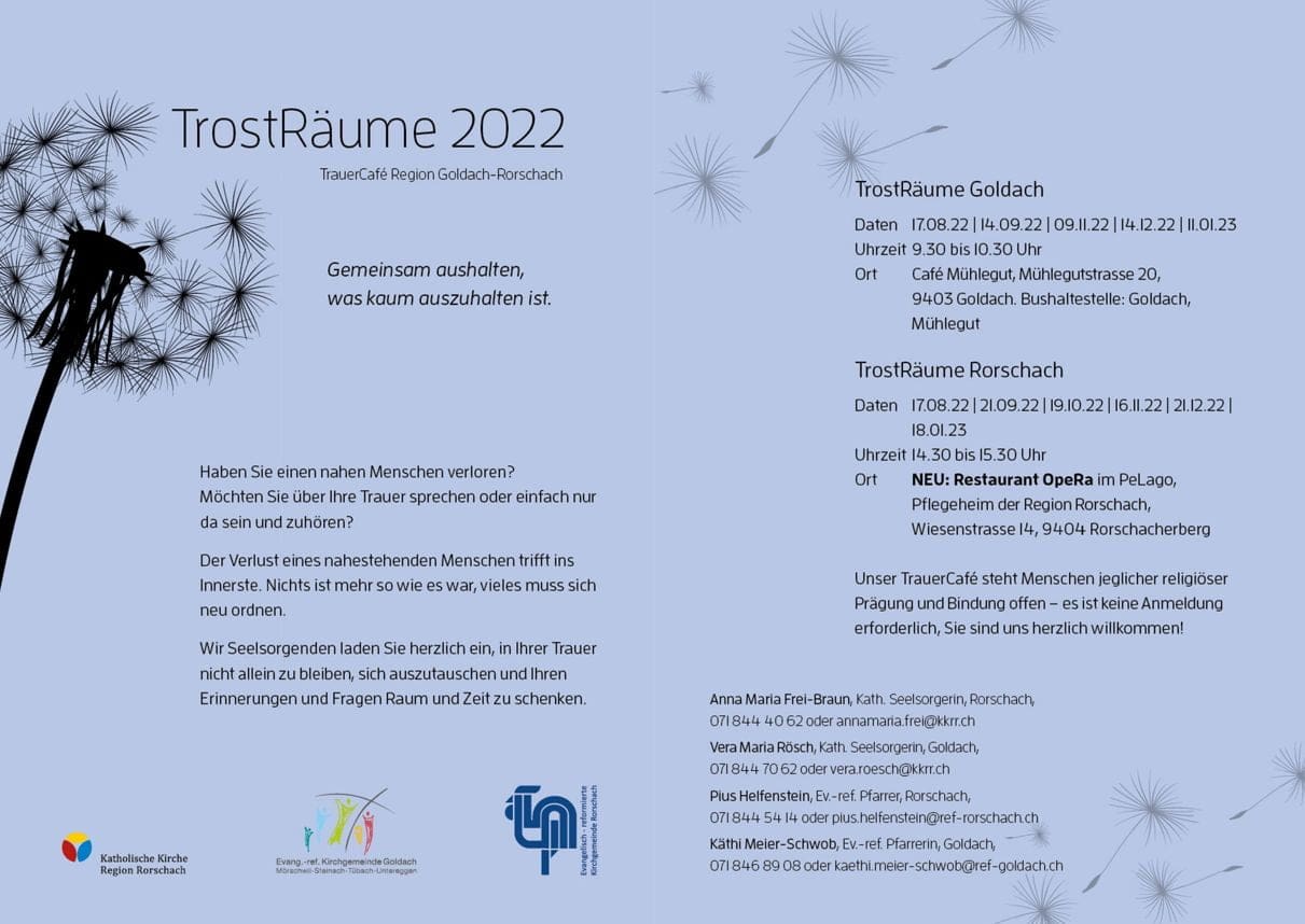 Die TrostRäume in Rorschach und Goldach werden nach der Sommerpause ab August wieder angeboten. Die Katholische Kirche der Region Rorschach sowie die Evang.-ref. Kirchgemeinden von Rorschach und Goldach sind verantwortlich für dieses Angebot. Jetzt sind die Daten für das 2. Halbjahr 2022 erschienen. Details finden Interessierte auf dem Flyer.