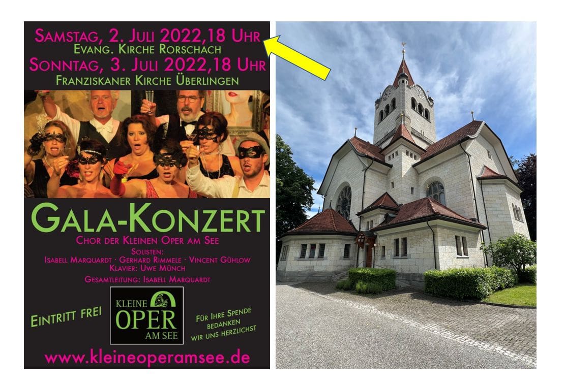 Heute Samstag, 2. Juli 2022, findet in der Evang.-ref. Kirche in Rorschach ein GALA-Konzert der Kleinen Oper am See statt. Start ist um 18 Uhr. Der Eintritt frei, Spenden sind erwünscht .