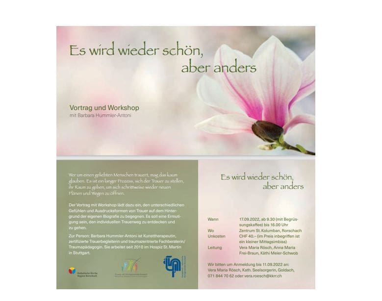 Vormerken: Vortrag & Workshop zum Thema „Trauer“Themen:KulturRorschach 3. Juli 2022 - 05:05Dieser Anlass mit Barbara Hummler-Antoni findet am 17. September im Zentrum St. Kolumban in Rorschach statt. Die nötigen Infos finden Interessierte auf dem Flyer.Teilen mit: Einen Link per E-Mail an einen Freund senden (Wird in neuem Fenster geöffnet) E-Mail Drucken (Wird in neuem Fenster geöffnet) Drucken Auf Facebook teilen (Wird in neuem Fenster geöffnet) Facebook Auf X teilen (Wird in neuem Fenster geöffnet) X Auf WhatsApp teilen (Wird in neuem Fenster geöffnet) WhatsApp Gefällt mir:Gefällt mir Wird geladen …Newsletter abonnieren Bitte dieses Feld leer lassenBitte wähle, ob Du über jeden neuen Beitrag sofort oder lieber jeden Morgen gegen 9 Uhr eine Zusammenfassung der neusten Beiträge erhalten möchtest.Liste(n) auswählen: Neues vom Echo (Zusammenfassung) Neues vom Echo (Sofortbenachrichtigung) Dieses Feld wird benötigt.Prüfen Sie Ihren Posteingang und den Spamordner, um Ihr Abonnement zu bestätigen.