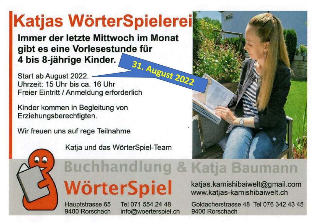 Und dann am 31. August startet das WörterSpiel-Team mit den monatlichen Vorlesestunde für Kinder. Jeden letzten Mittwoch im Monat wird Katja Baumann von 15-16 Uhr den Kindern zwischen 4 und 8 Jahren eine Geschichte in der Buchhandlung vorlesen.