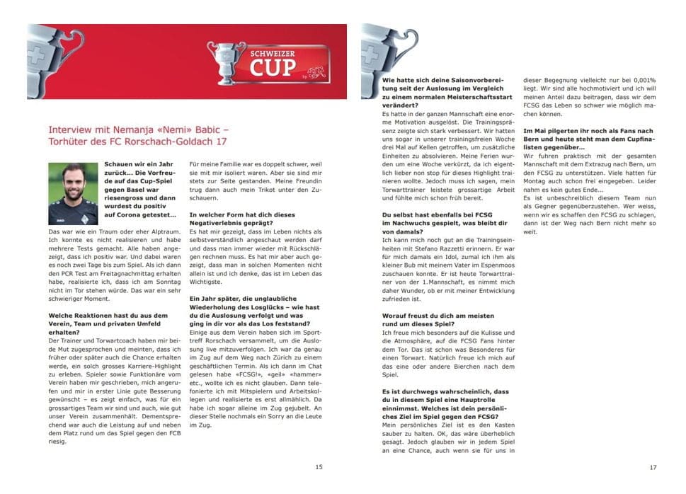 Das Interview mit dem FCRG 17-Torhüter Nemi Babic im Matchprogramm zeigt, wie eng die Amateure eigentlich mit den Profis zumindest emotional verbunden sind. Da ist nicht viel von Rivalität zu spüren, aber von viel Respekt und Anerkennung. Das sind dann auch die idealen Zutaten für ein friedliches Fussballfest auf dem Espenmoos.
