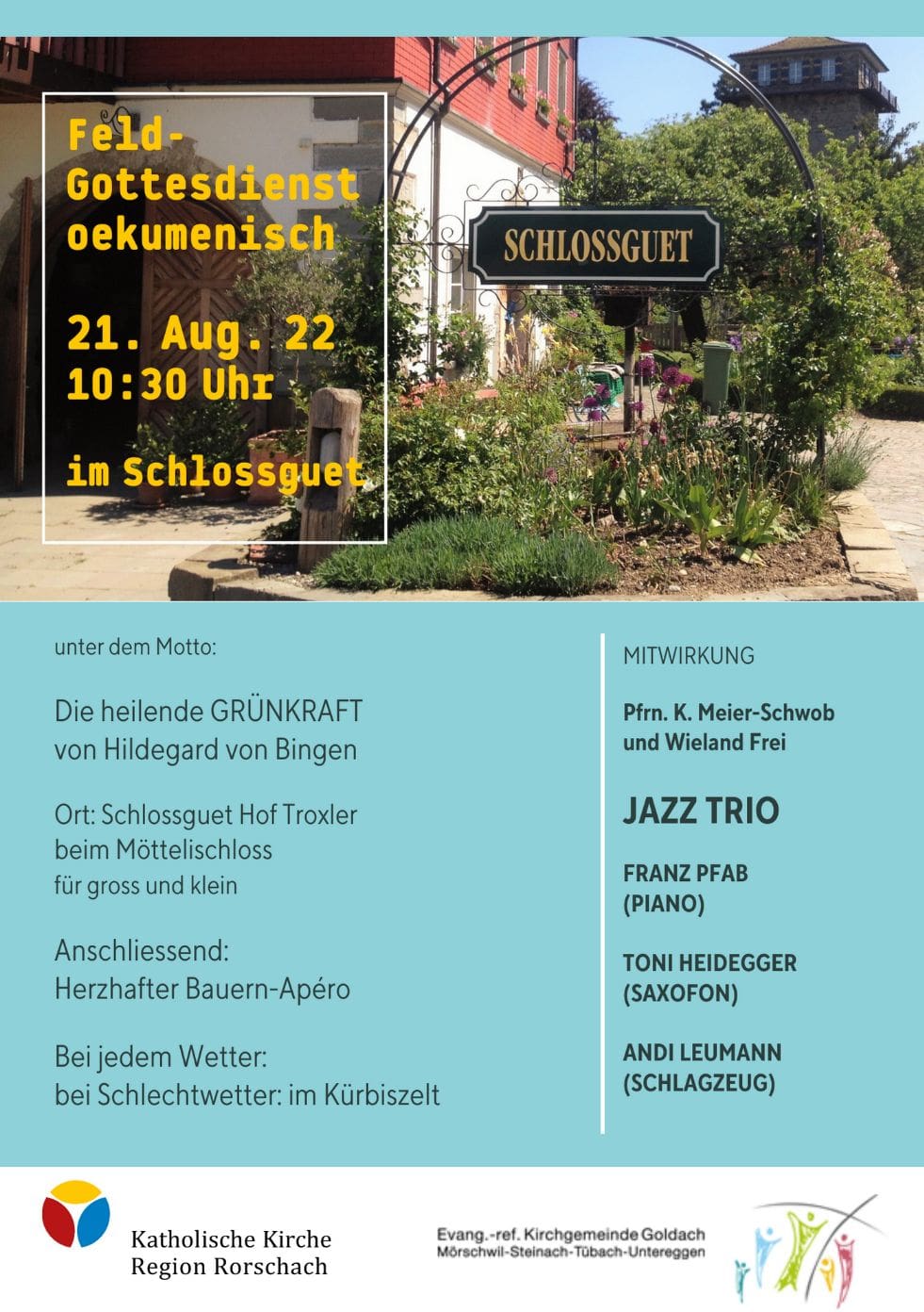 Ökumenischer Feldgottesdienst im SchlossguetThemen:GoldachKulturPartnerRef. GoldachUntereggen 20. August 2022 - 05:10Nachstehend die Übersicht aller Aktivitäten morgen Sonntag.Hier noch ein erster Hinweis auf das Highlight am ersten Wochenende im September: Teilen mit: Klicken, um einem Freund einen Link per E-Mail zu senden (Wird in neuem Fenster geöffnet) E-Mail Klicken zum Ausdrucken (Wird in neuem Fenster geöffnet) Drucken Klick, um auf Facebook zu teilen (Wird in neuem Fenster geöffnet) Facebook Klicke, um auf X zu teilen (Wird in neuem Fenster geöffnet) X Klicken, um auf WhatsApp zu teilen (Wird in neuem Fenster geöffnet) WhatsApp Gefällt mir:Gefällt mir Wird geladen …Newsletter abonnieren Bitte dieses Feld leer lassenBitte wähle, ob Du über jeden neuen Beitrag sofort oder lieber jeden Morgen gegen 9 Uhr eine Zusammenfassung der neusten Beiträge erhalten möchtest.Liste(n) auswählen: Neues vom Echo (Zusammenfassung) Neues vom Echo (Sofortbenachrichtigung) Dieses Feld wird benötigt.Prüfen Sie Ihren Posteingang und den Spamordner, um Ihr Abonnement zu bestätigen.