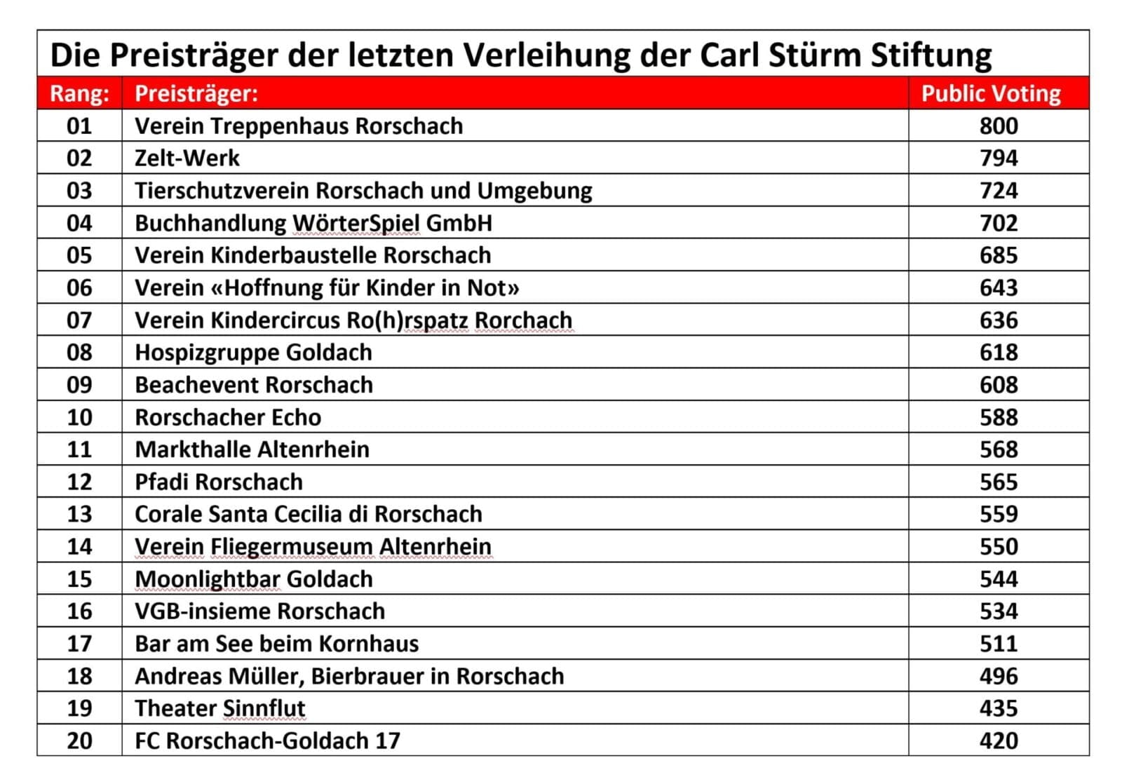 Die Carl Stürm Stiftung hat heute zur 17. und auch letzten Preisverleihung in den Carmen Würth Saal in Rorschach eingeladen. Für Stiftungsratspräsident Peter Thoma ein würdiger Schlusspunkt eines Engagements, dank dem die Öffentlichkeit Jahr für Jahr die Vielfalt unserer Region am See miterleben durfte. Der heutige Abschied war bereits bei der Gründung der Stiftung vorhersehbar. Denn das vom Stifter Carl Felix Stürm eingebrachte Kapital war zum Verzehr bestimmt. Nach 17 Preisverleihungen mit Preisgeldern zwischen 30‘000 und 50‘000 Franken und mit der dazu gehörenden Betreuung der Gäste mit Speis‘, Trank, Raummiete und kulturellem Rahmenprogramm ist dieses Geld nun aufgebraucht; die Carl Stürm Stiftung wird aufgelöst. Eine ausführliche Würdigung folgt morgen hier auf dem Rorschacher Echo. Nachstehend alle Preisträger der letzten 17 Jahre: