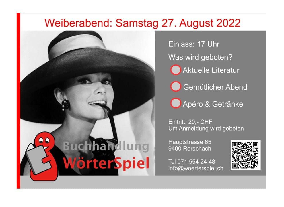 Details zu diesem Anlass finden interessierte Frauen auch auf der WörterSpiel-Homepage. Am Mittwoch, 31. August 2022, findet eine Vorlesestunde für 4 bis 8-jährige Kinder. Details findet man unten auf dem Handzettel.