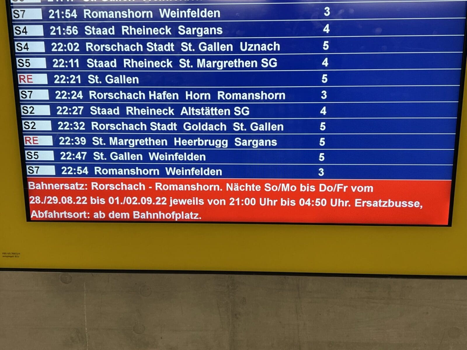 Ab heute Abend sind wieder Ersatzbusse unterwegsThemen:RegionRorschach 28. August 2022 - 05:05Betrifft jene, die auf der Seelinie mit der Bahn unterwegs sind. Man tut gut daran, den Fahrplan zu konsultieren.Teilen mit: Einen Link per E-Mail an einen Freund senden (Wird in neuem Fenster geöffnet) E-Mail Drucken (Wird in neuem Fenster geöffnet) Drucken Auf Facebook teilen (Wird in neuem Fenster geöffnet) Facebook Auf X teilen (Wird in neuem Fenster geöffnet) X Auf WhatsApp teilen (Wird in neuem Fenster geöffnet) WhatsApp Gefällt mir:Gefällt mir Wird geladen …Newsletter abonnieren Bitte dieses Feld leer lassenBitte wähle, ob Du über jeden neuen Beitrag sofort oder lieber jeden Morgen gegen 9 Uhr eine Zusammenfassung der neusten Beiträge erhalten möchtest.Liste(n) auswählen: Neues vom Echo (Zusammenfassung) Neues vom Echo (Sofortbenachrichtigung) Dieses Feld wird benötigt.Prüfen Sie Ihren Posteingang und den Spamordner, um Ihr Abonnement zu bestätigen.