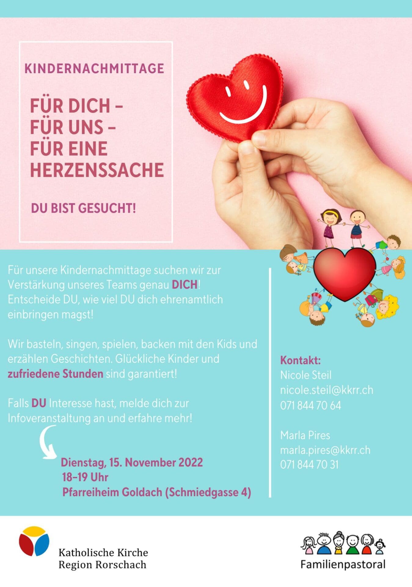 Falls DU Interesse hast, melde dich zur Infoveranstaltung an und erfahre mehr: Dienstag, 15.11.2022, 18−19 Uhr, Pfarreiheim Goldach.