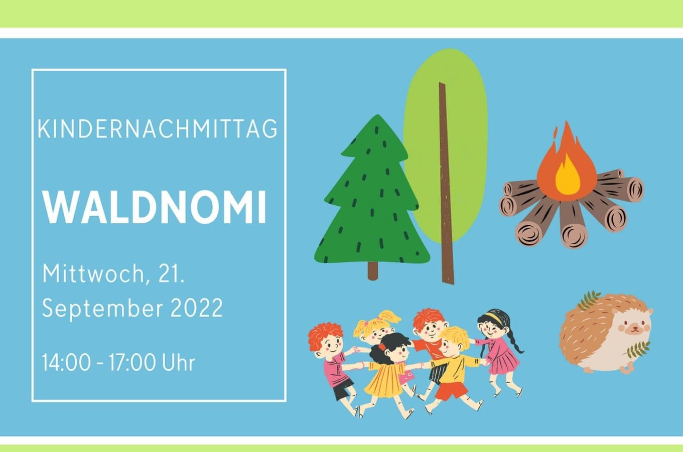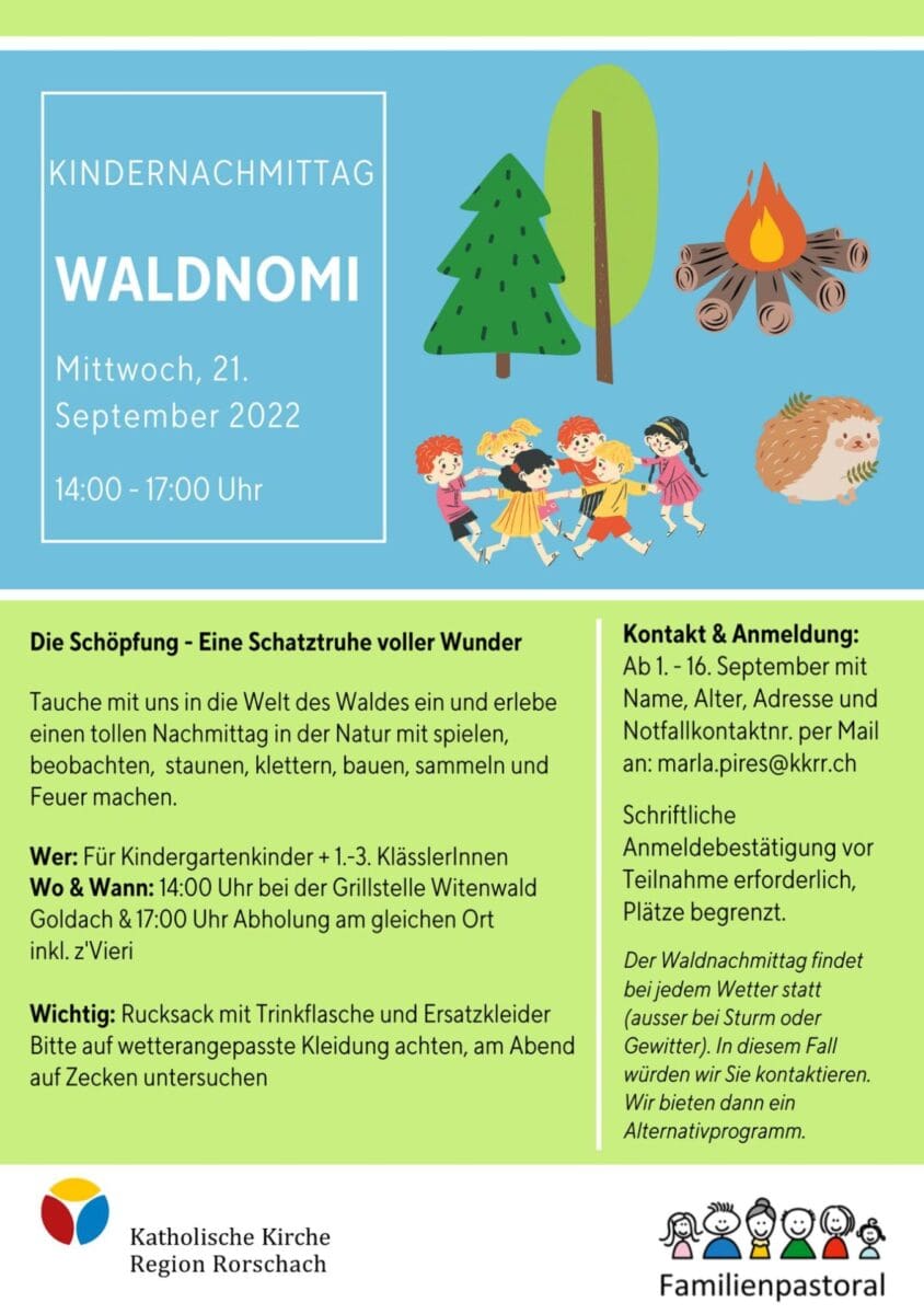 Kindernachmittag im Wald am 21. SeptemberThemen:Kath. RorschachKulturPartnerRorschach 6. September 2022 - 05:20Anmelden muss man sich bis 16. September 2022. Alle relevanten Infos findet man auf dem Flyer und hier.Teilen mit: Einen Link per E-Mail an einen Freund senden (Wird in neuem Fenster geöffnet) E-Mail Drucken (Wird in neuem Fenster geöffnet) Drucken Auf Facebook teilen (Wird in neuem Fenster geöffnet) Facebook Auf X teilen (Wird in neuem Fenster geöffnet) X Auf WhatsApp teilen (Wird in neuem Fenster geöffnet) WhatsApp Gefällt mir:Gefällt mir Wird geladen …Newsletter abonnieren Bitte dieses Feld leer lassenBitte wähle, ob Du über jeden neuen Beitrag sofort oder lieber jeden Morgen gegen 9 Uhr eine Zusammenfassung der neusten Beiträge erhalten möchtest.Liste(n) auswählen: Neues vom Echo (Zusammenfassung) Neues vom Echo (Sofortbenachrichtigung) Dieses Feld wird benötigt.Prüfen Sie Ihren Posteingang und den Spamordner, um Ihr Abonnement zu bestätigen.