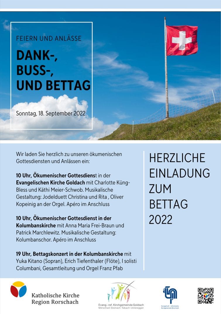 Viel Ökumene am Bettag – Konzert zum AbschlussThemen:GoldachKath. RorschachKulturPartnerRef. GoldachRef. RorschachRorschach 17. September 2022 - 05:10Morgen Sonntag findet um 10 Uhr ein ökumenischer Gottesdienst in der Evangelischen Kirche in Goldach statt, parallel dazu ebenfalls in der Kolumbanskirche in Rorschach. Abgerundet wird der Bettag mit einem Konzert um 19 Uhr in der Kolumbanskirche.Teilen mit: Einen Link per E-Mail an einen Freund senden (Wird in neuem Fenster geöffnet) E-Mail Drucken (Wird in neuem Fenster geöffnet) Drucken Auf Facebook teilen (Wird in neuem Fenster geöffnet) Facebook Auf X teilen (Wird in neuem Fenster geöffnet) X Auf WhatsApp teilen (Wird in neuem Fenster geöffnet) WhatsApp Gefällt mir:Gefällt mir Wird geladen …Newsletter abonnieren Bitte dieses Feld leer lassenBitte wähle, ob Du über jeden neuen Beitrag sofort oder lieber jeden Morgen gegen 9 Uhr eine Zusammenfassung der neusten Beiträge erhalten möchtest.Liste(n) auswählen: Neues vom Echo (Zusammenfassung) Neues vom Echo (Sofortbenachrichtigung) Dieses Feld wird benötigt.Prüfen Sie Ihren Posteingang und den Spamordner, um Ihr Abonnement zu bestätigen.