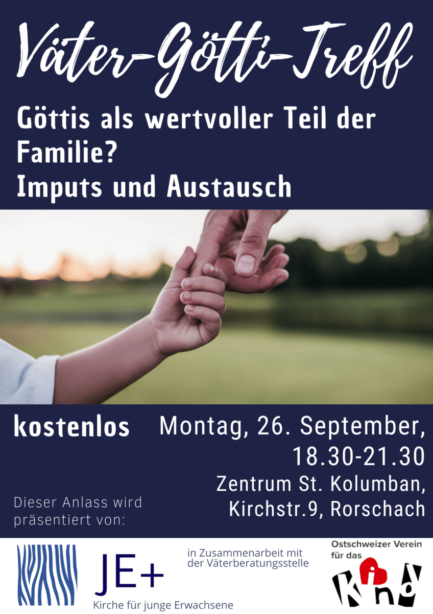 „Vatersein heute…“ – Väter-Götti-Treff RorschachThemen:KulturRorschach 25. September 2022 - 05:18Morgen Montag im Zentrum St. Kolumban in Rorschach. Weiterreichende Informationen finden Interessierte auf dem Flyer.Teilen mit: Einen Link per E-Mail an einen Freund senden (Wird in neuem Fenster geöffnet) E-Mail Drucken (Wird in neuem Fenster geöffnet) Drucken Auf Facebook teilen (Wird in neuem Fenster geöffnet) Facebook Auf X teilen (Wird in neuem Fenster geöffnet) X Auf WhatsApp teilen (Wird in neuem Fenster geöffnet) WhatsApp Gefällt mir:Gefällt mir Wird geladen …Newsletter abonnieren Bitte dieses Feld leer lassenBitte wähle, ob Du über jeden neuen Beitrag sofort oder lieber jeden Morgen gegen 9 Uhr eine Zusammenfassung der neusten Beiträge erhalten möchtest.Liste(n) auswählen: Neues vom Echo (Zusammenfassung) Neues vom Echo (Sofortbenachrichtigung) Dieses Feld wird benötigt.Prüfen Sie Ihren Posteingang und den Spamordner, um Ihr Abonnement zu bestätigen.